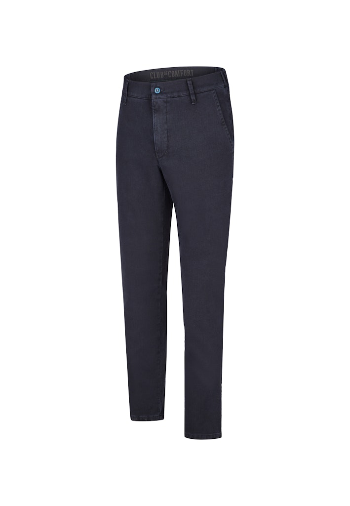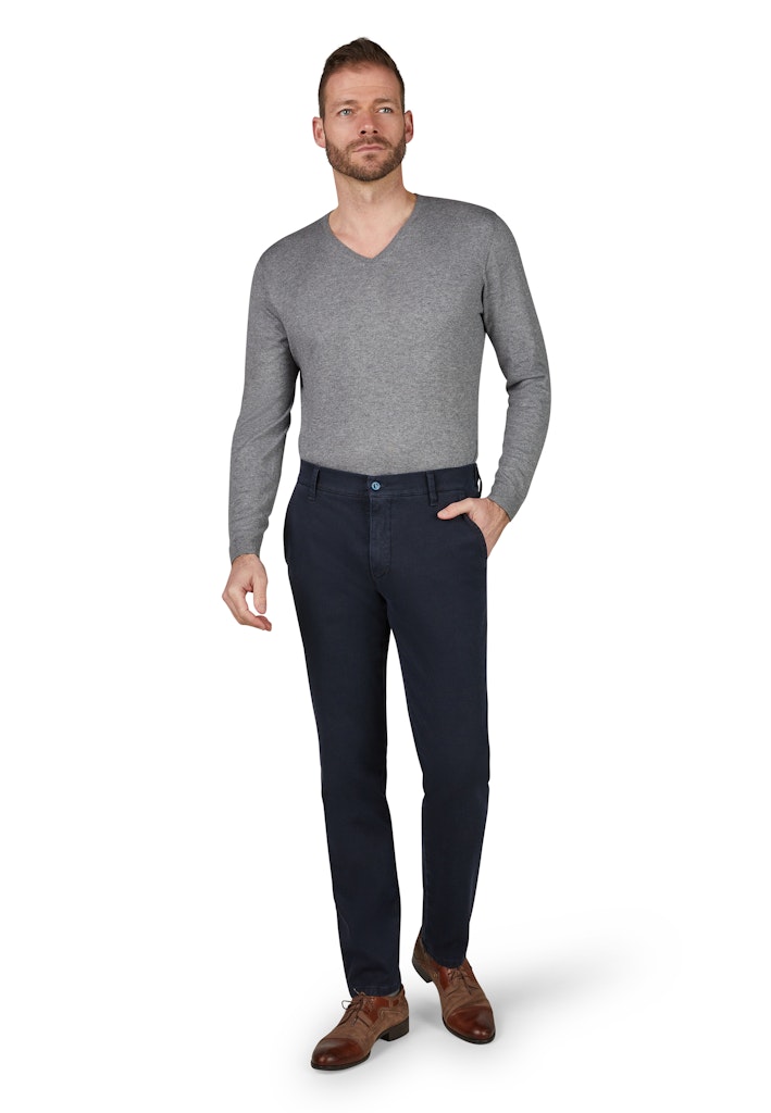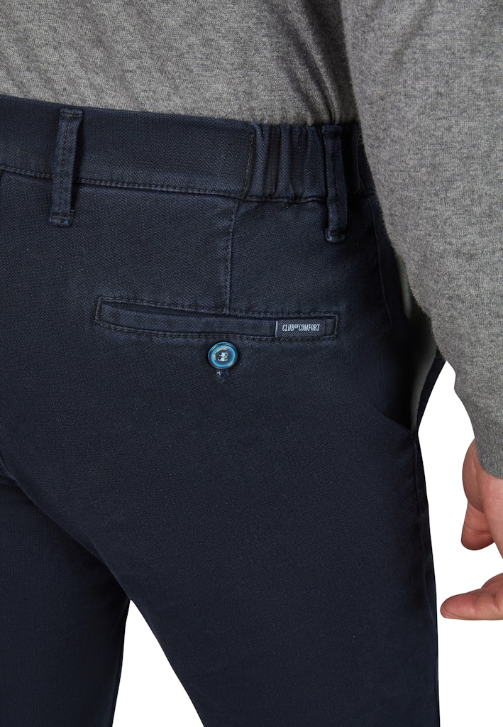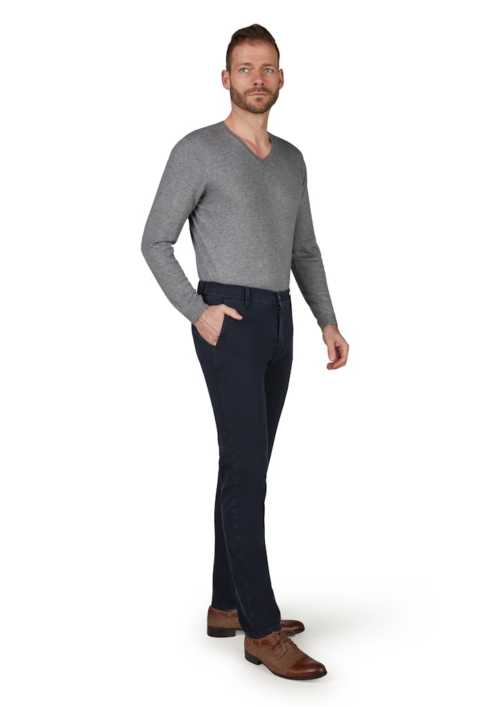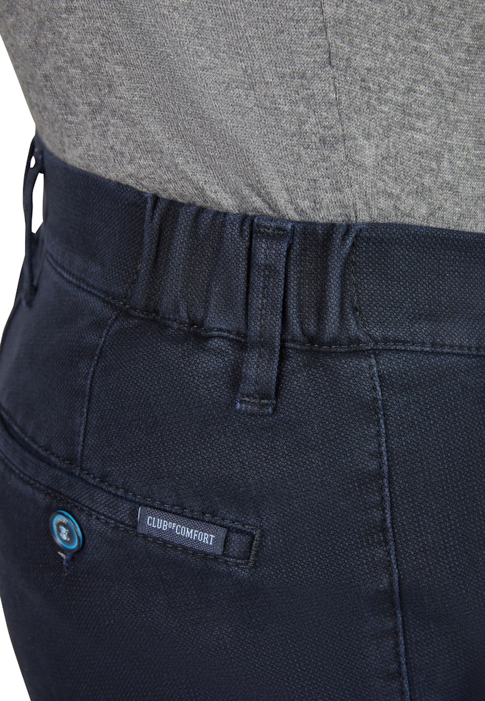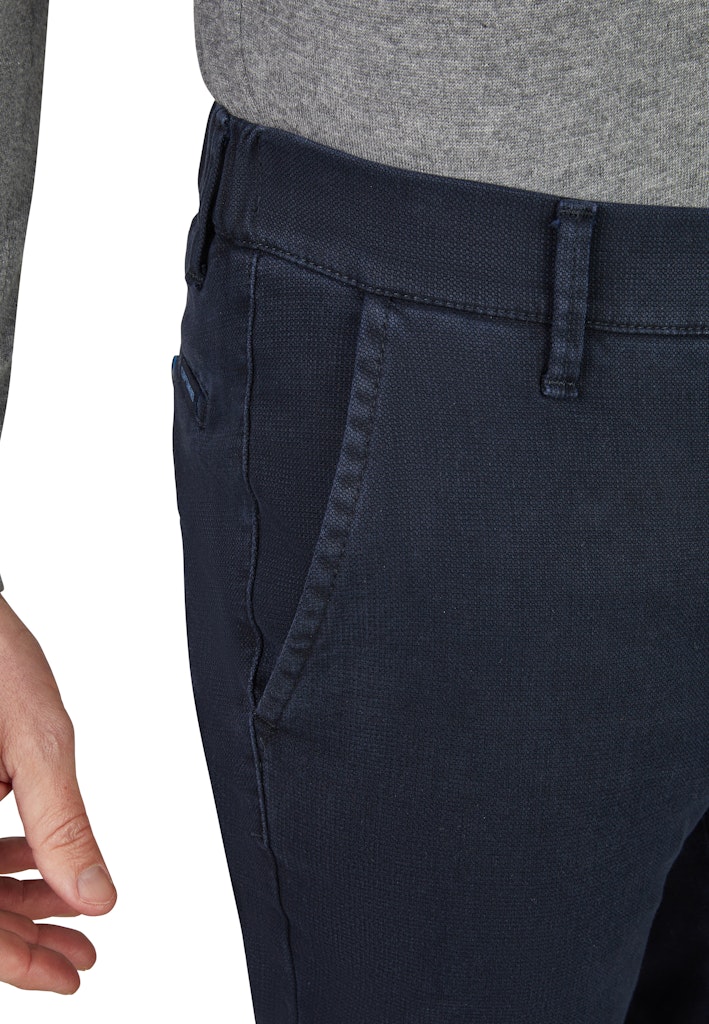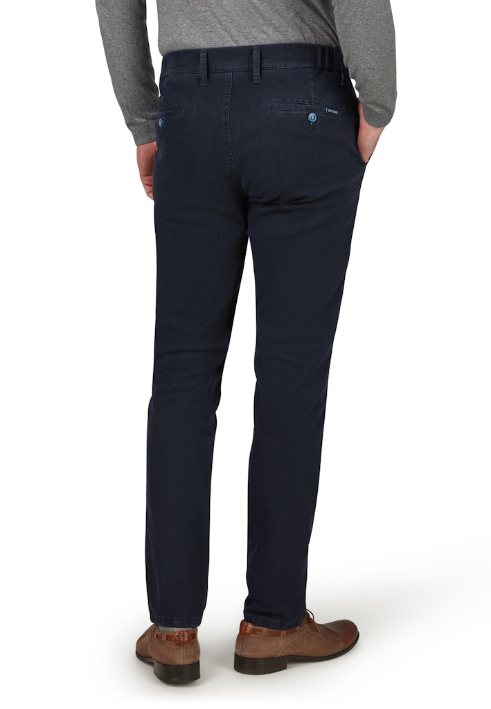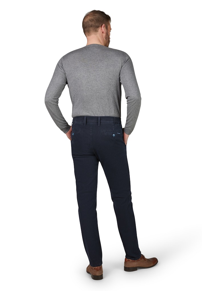 Super bequeme Chino im Slim Fit mit superelastischem Smokbund und Hemdstopper. Gefertigt aus einer hochelastischer High Stretch-Baumwolle in wunderschöner Dobby-Struktur. Das Double Dye-Verfahren verleiht der Hose einen casualigen Look.Gewicht: 445 g/lfm Das Modell bietet eine mittlere Leibhöhe und ein schlankes Bein bei schmaler Fußweite.