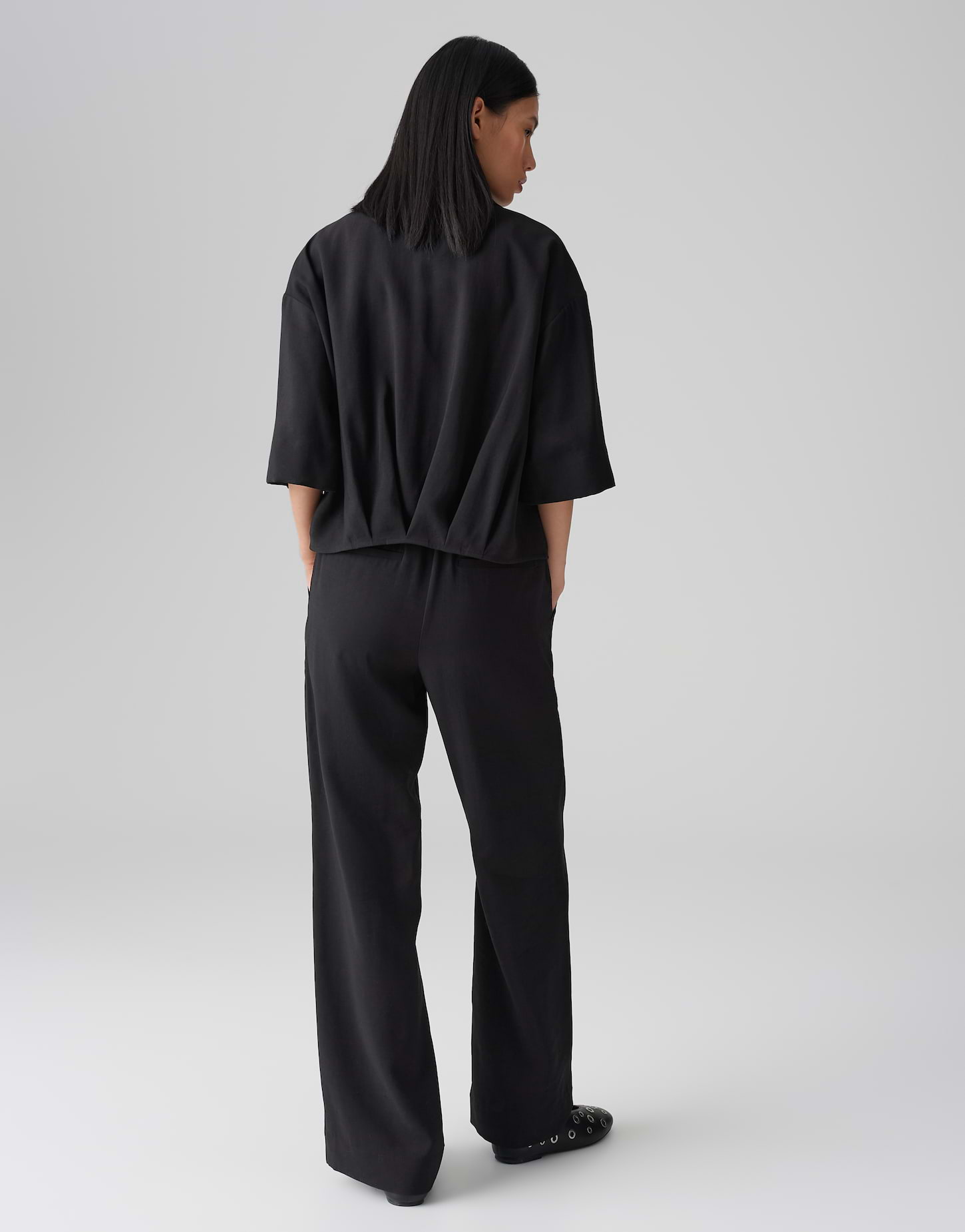 weite Passform, gerader Schnitt, überschnittene Schulter mit 3/4 Arm, Hemdblusenkragen, Rückenlänge ca. 55 cm bei Größe 36, Model Größe 177 cm - trägt Größe 36, Webware, weicher Griff, matter Glanz in der Oberfläche, fließender Fall, Webware, weicher Griff, matter Glanz in der Oberfläche, fließender Fall