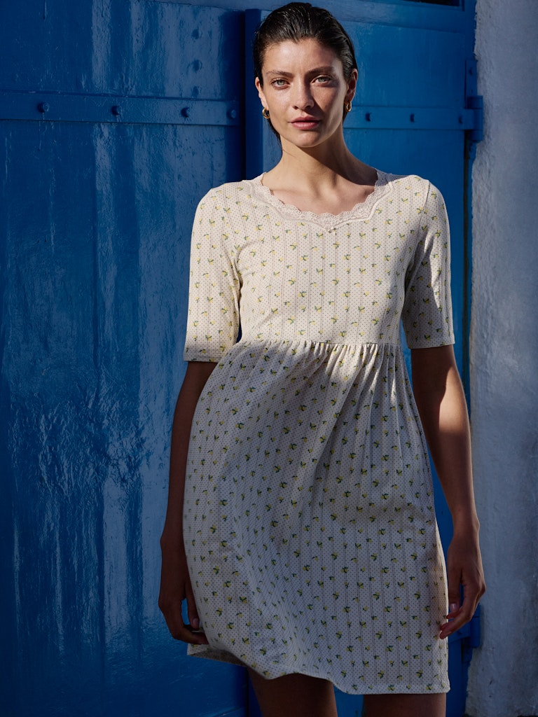 Babydoll-Nachtemd mit kurzem Arm|Jacquard-Optik durch feinen Nadelzug|lange Farbbrillanz, reduzierte Pillingbildung und hohe Strapazierfähigkeit|mit natürlichem Glanz und glattem Griff|Dresdner Spitze am Dekolleté