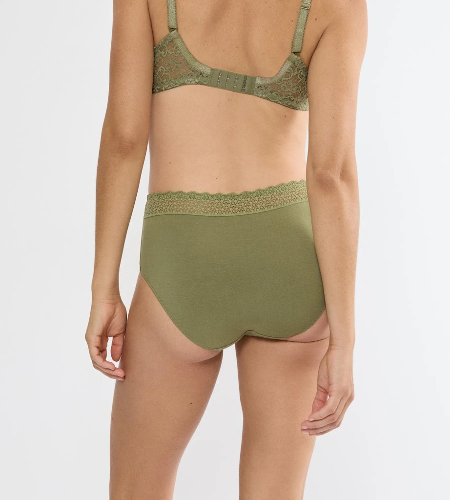 hautsympathischen und beruhigenden Eigenschaften auszeichnet. Der Bund ist mit Spitze eingefasst und ebenfalls recycelt. Ergänzt unser