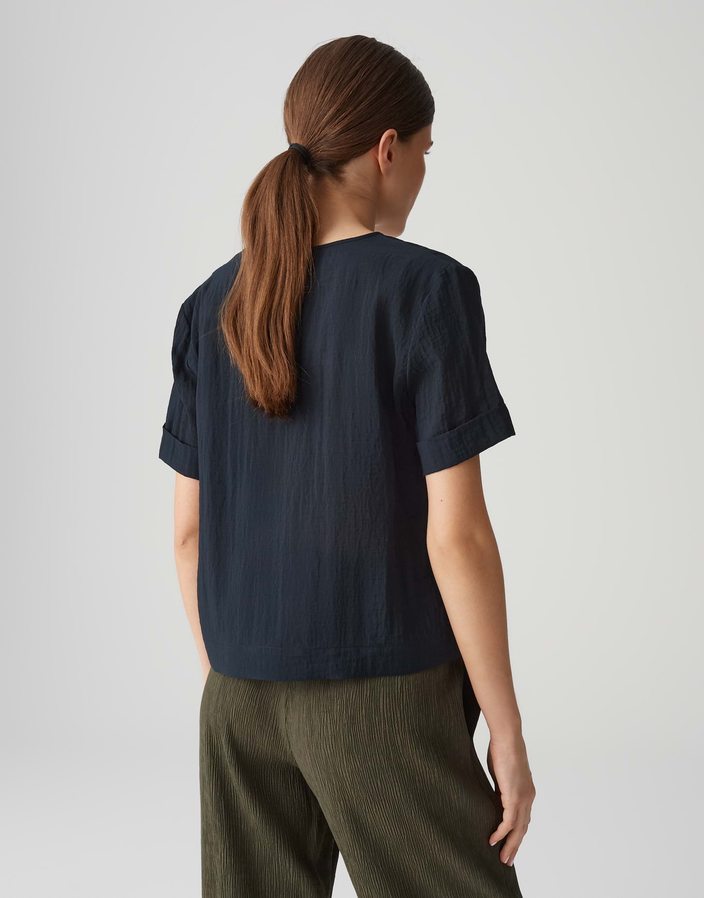 weite Passform, leicht ausgestellter Schnitt, leicht verkürzter Schnitt, Kurzarm, V-Ausschnitt, Rückenlänge ca. 56 cm bei Größe 36, Model Größe 175 cm - trägt Größe 36, Webware, dezente Twillstruktur, natürlicher Griff, luftdurchlässig, abgesteppte Biese vorne, kleine Schlitze in den Seiten, Aufschlag am Ärmel
