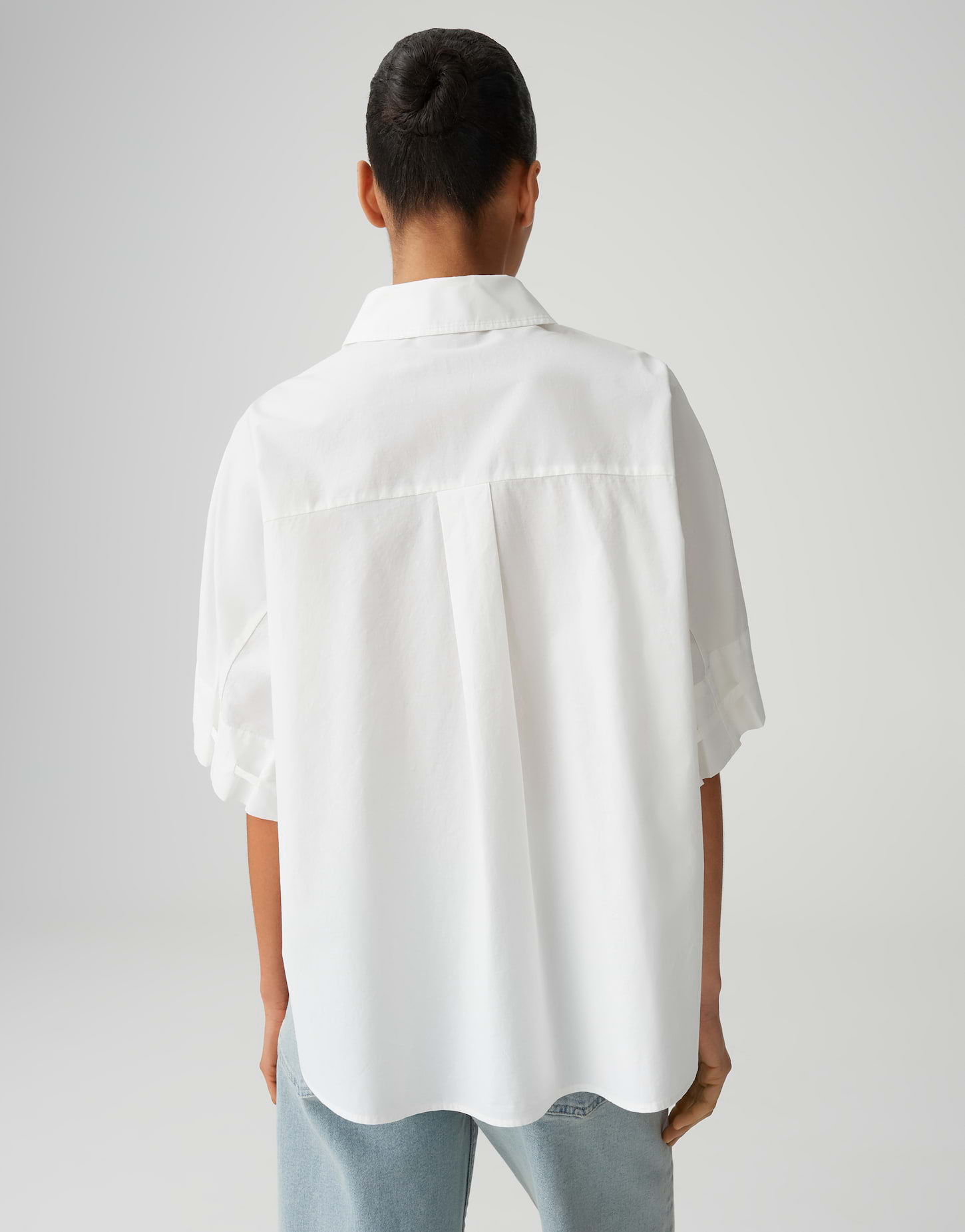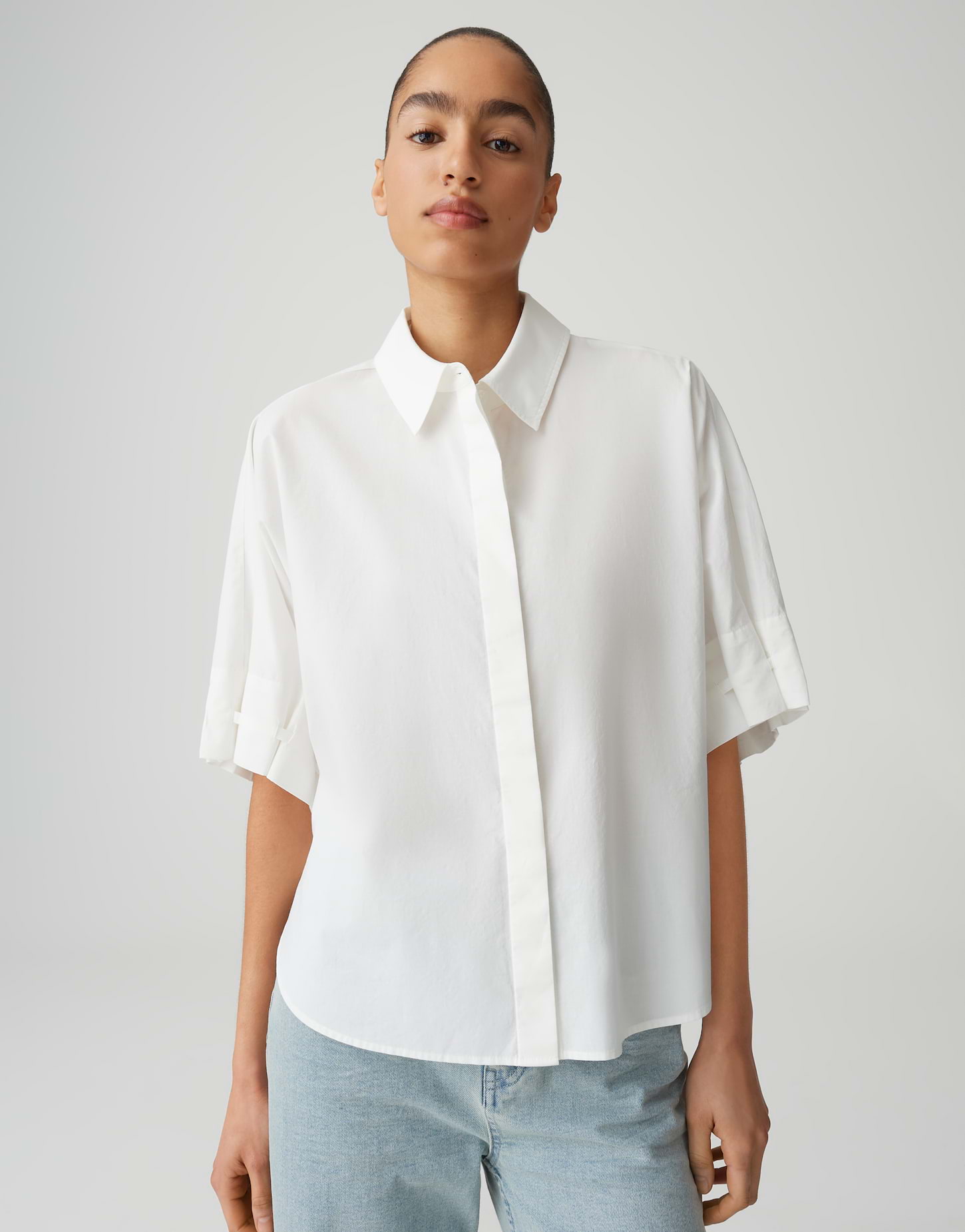 weite Passform, gerader Schnitt, hinten länger als vorne, überschnittener Halbarm, Hemdblusenkragen, Rückenlänge ca. 66 cm bei Größe 36, Model Größe 177 cm - trägt Größe 36, Popelin, Webware, glatter Griff, leichte Transparenz, Rückenpasse mit Quetschfalte, abgerundeter Saum, verdeckte Knopfleiste, Tunnelzug am Ärmelsaum