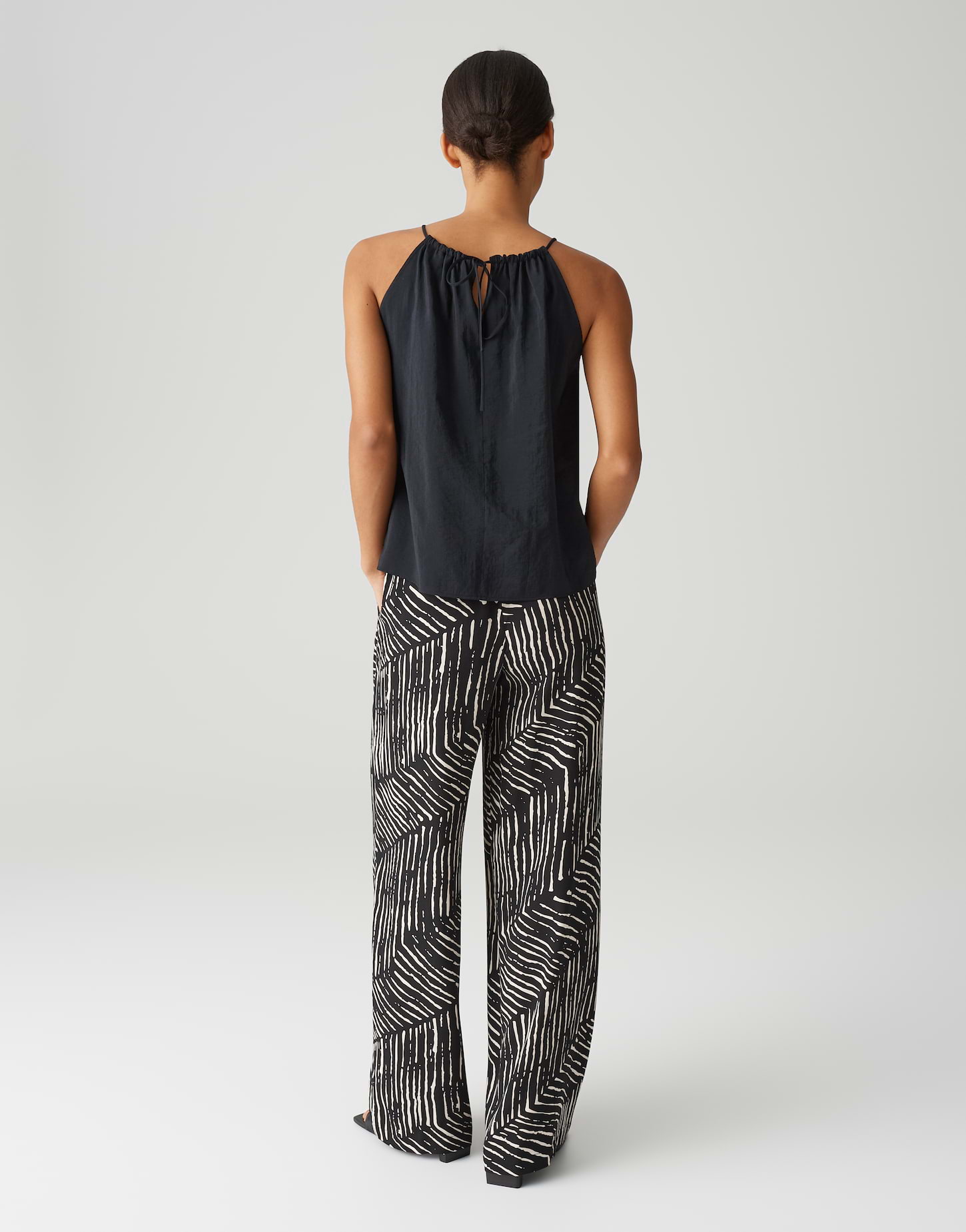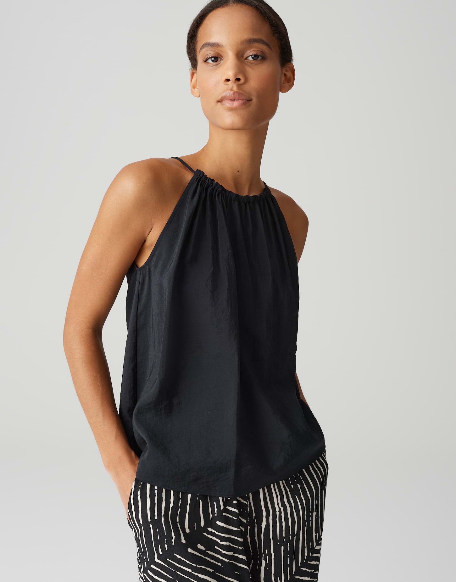 lockere Passform, ausgestellt geschnitten, normale Länge, schmale Träger, Rundhalsausschnitt, Rückenlänge ca. 51 cm bei Größe 36, Model Größe 176 cm - trägt Größe 36, Webware, dezente Struktur, weicher Griff, matter Glanz in der Oberfläche, fließender Fall, Kräuselung am Halsloch, Bindeband am hinteren Halsloch, Schlitz im Rücken