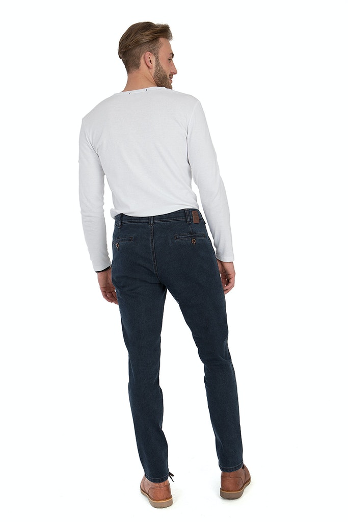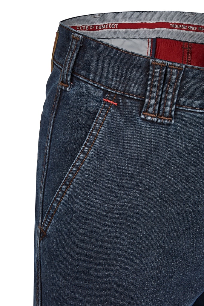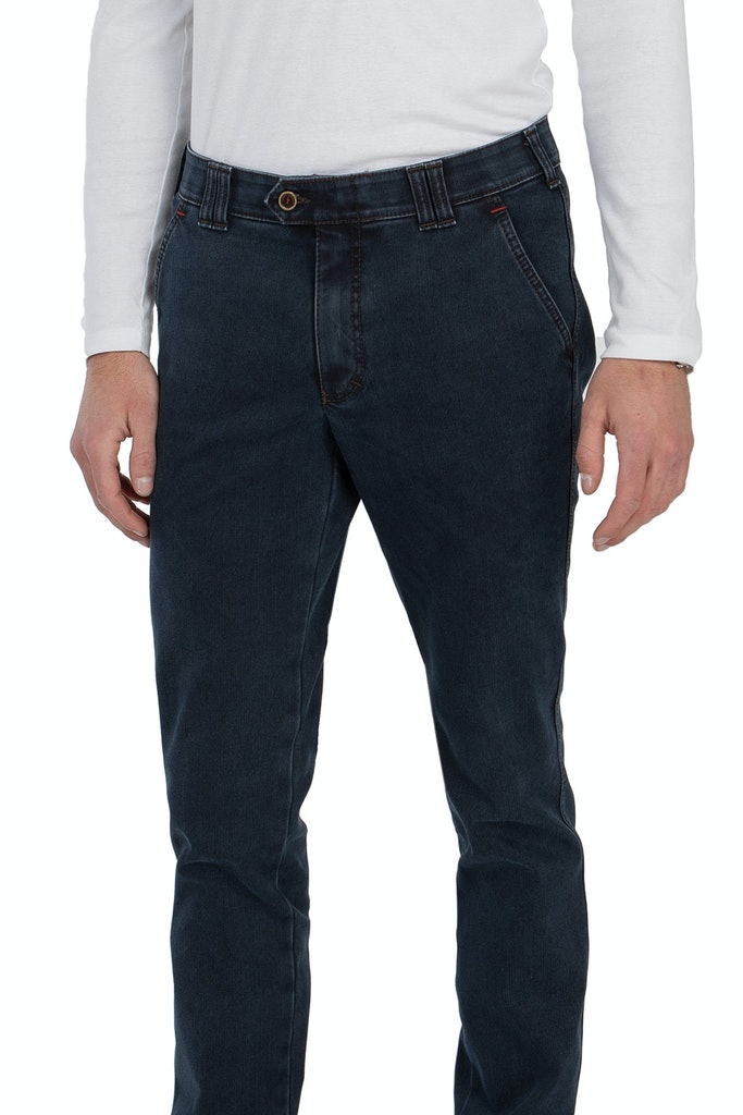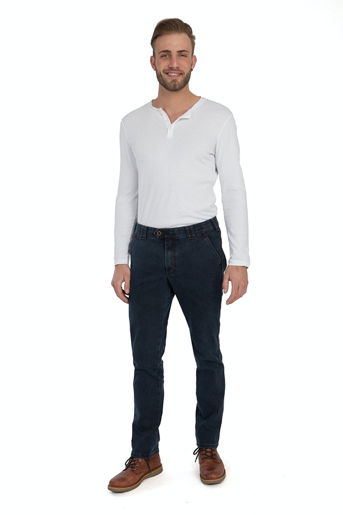 Bequeme Flat Front-Hose mit elastischem Komfortbund und Hemdstopper. Dazu die praktische Bundverlängerung mit Knopf und Haken. Gerfertigt aus einem High Stretch-Denim mit Thermolite-Wärmeisolierung. Hier wird ein High-Tech-Gewebe aus THERMOLITE® Micro-Fasern direkt auf die Geweberückseite bondiert, das aus Hohlfasern besteht, in dem warme Luft gespeichert und bei Bedarf wieder abgegeben wird. Gewicht: 560 g/lfm Das Modell bietet eine normale Leibhöhe und wegen der schmaleren Fußweite einen schlankeren Beinverlauf und ist das Nachfolgemodell der Dallas 4624.