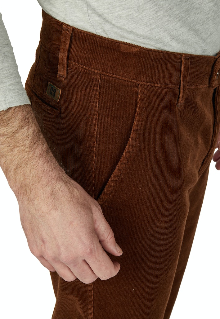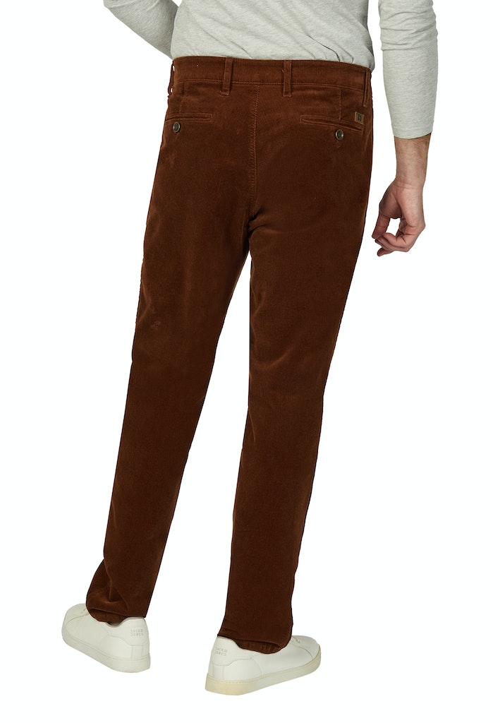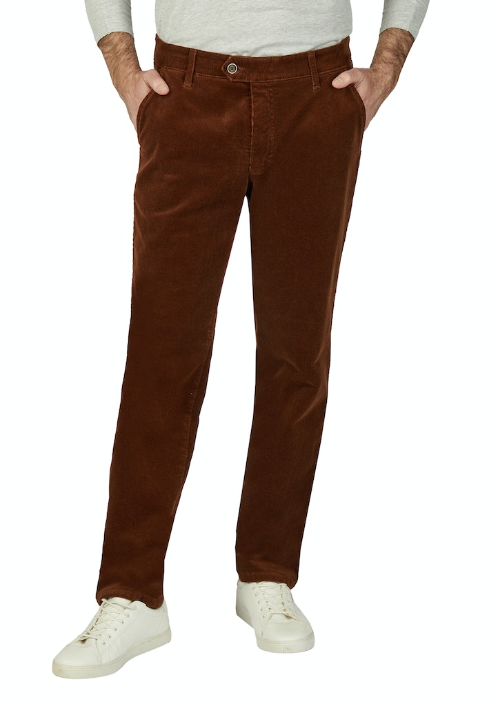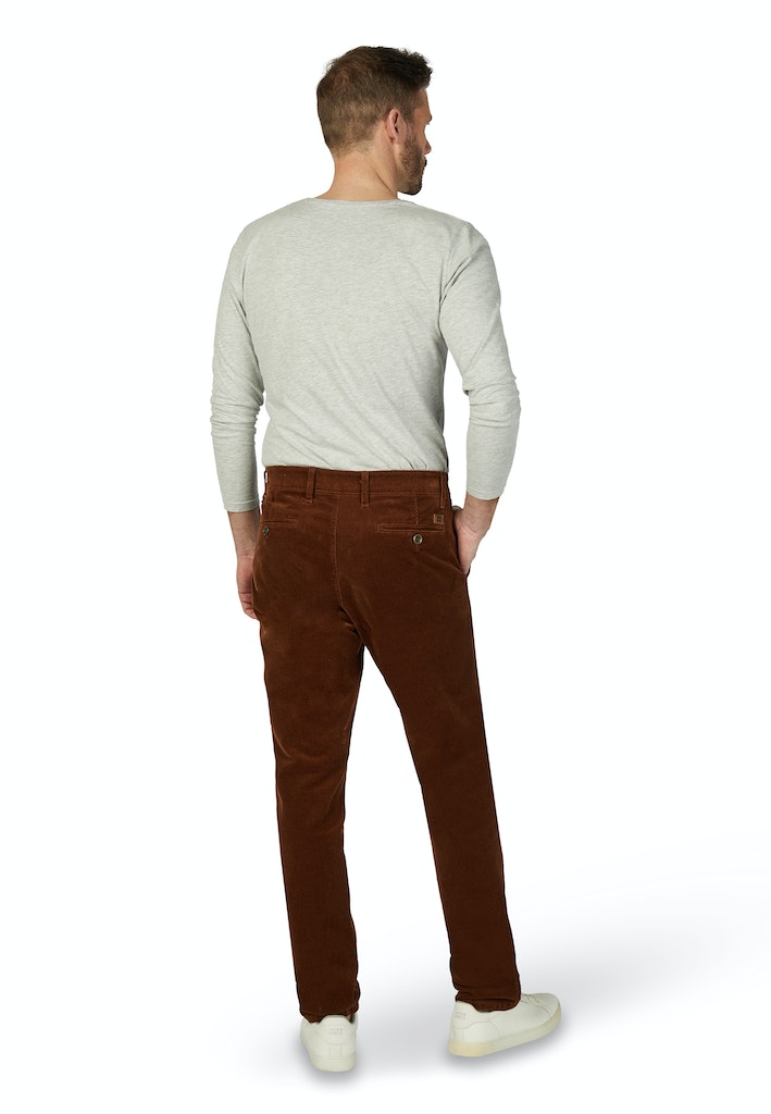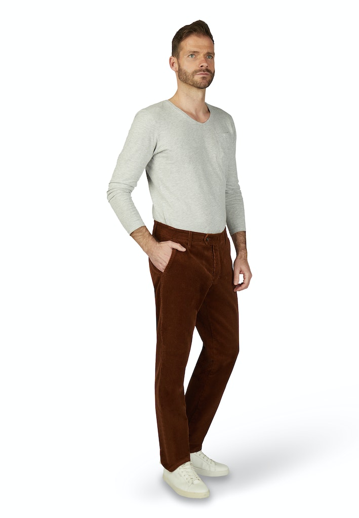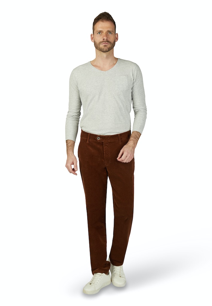 Bequeme Flat Front-Hose mit elastischem Komfortbund und Hemdstopper. Dazu die praktische Bundverlängerung mit Knopf und Haken. Gerfertigt aus einem Feincord mit High Stretch mit weichem Griff in casualiger Optik. Gewicht: 505 g/lfm Das Modell bietet eine normale Leibhöhe und wegen der schmaleren Fußweite einen schlankeren Beinverlauf.