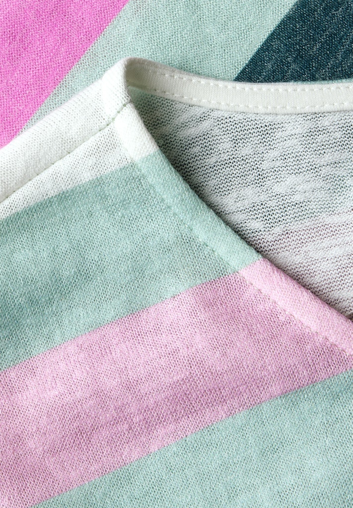 Dieses Shirt von Street One für Damen begeistert mit breiten Streifen und einer luftigen Passform. Die seitlichen Schlitze und die Dropped Shoulders unterstreichen den lässigen Look. Der angenehme Materialmix sorgt für hohen Tragekomfort. Shirt mit seitlichen Schlitzen Rundhalsausschnitt Dropped Shoulder Breite Streifen Angenehmer Materialmix Material: 80% Polyester, 20% Viskose