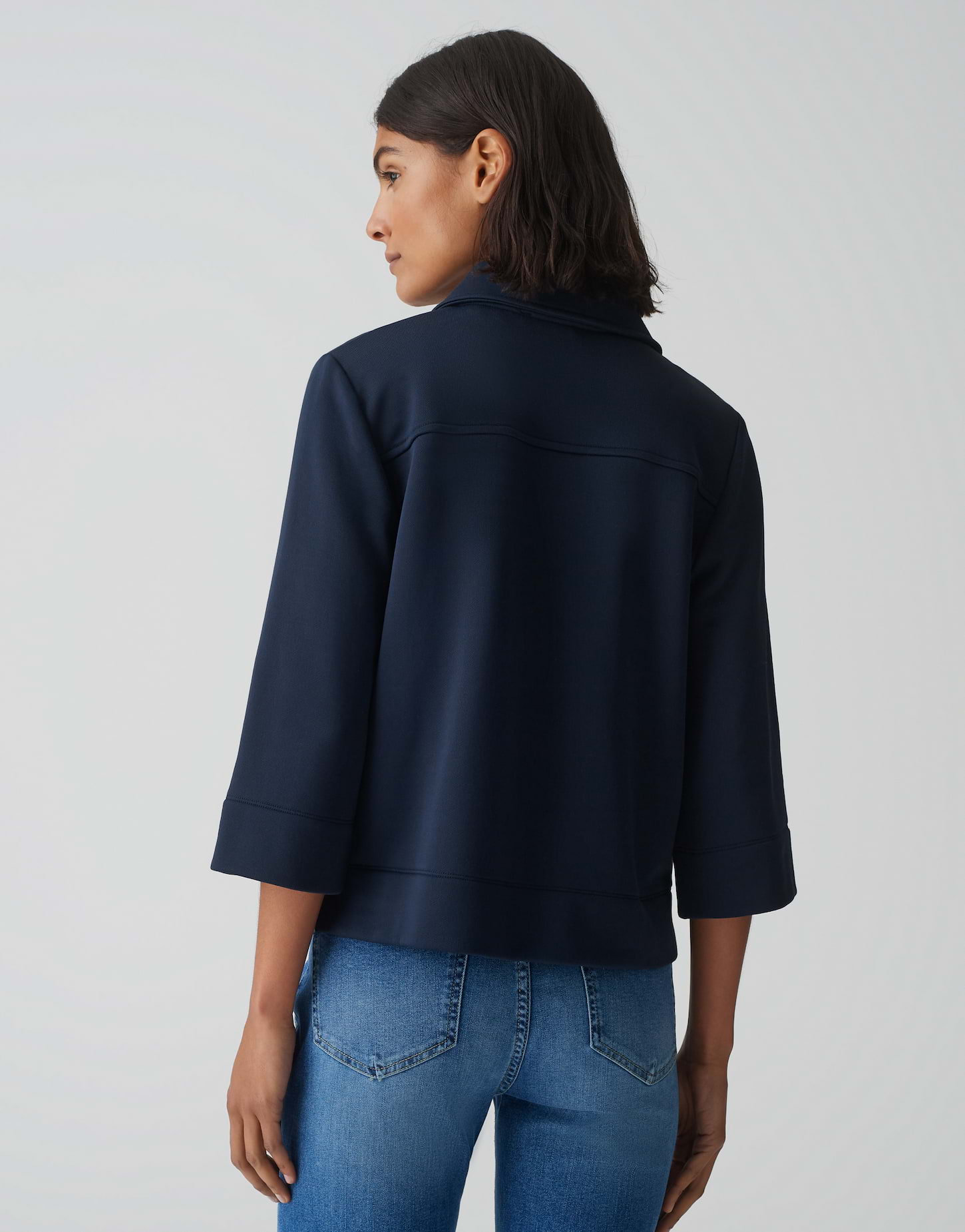 lockere Passform, gerader Schnitt, leicht verkürzt geschnitten, 3/4 Arm, V-Ausschnitt, Polokragen, Rückenlänge ca. 55 cm bei Größe 36, Model Größe 178 cm - trägt Größe 36, Sweatware, dezente Struktur, breiter Saum, Schlitze in den Seiten, überschnittene Schultern, Passe im Rücken