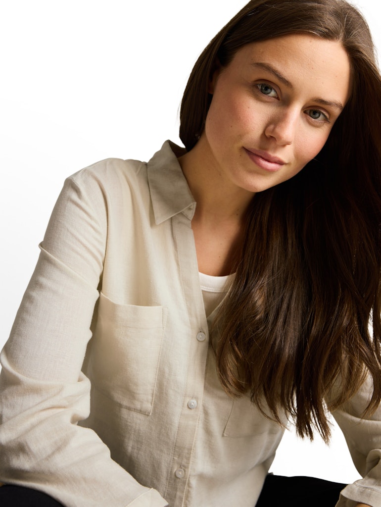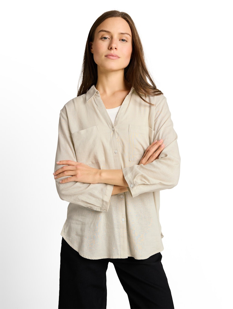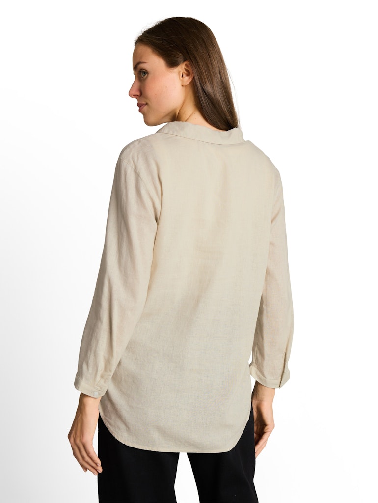 Leinenbluse mit aufgesetzten Brusttaschen und Seitenschlitzen. Leinenanteil eignet sich ideal im Frühling und Sommer für ein leichtes und kühlendes Tragegefühl.