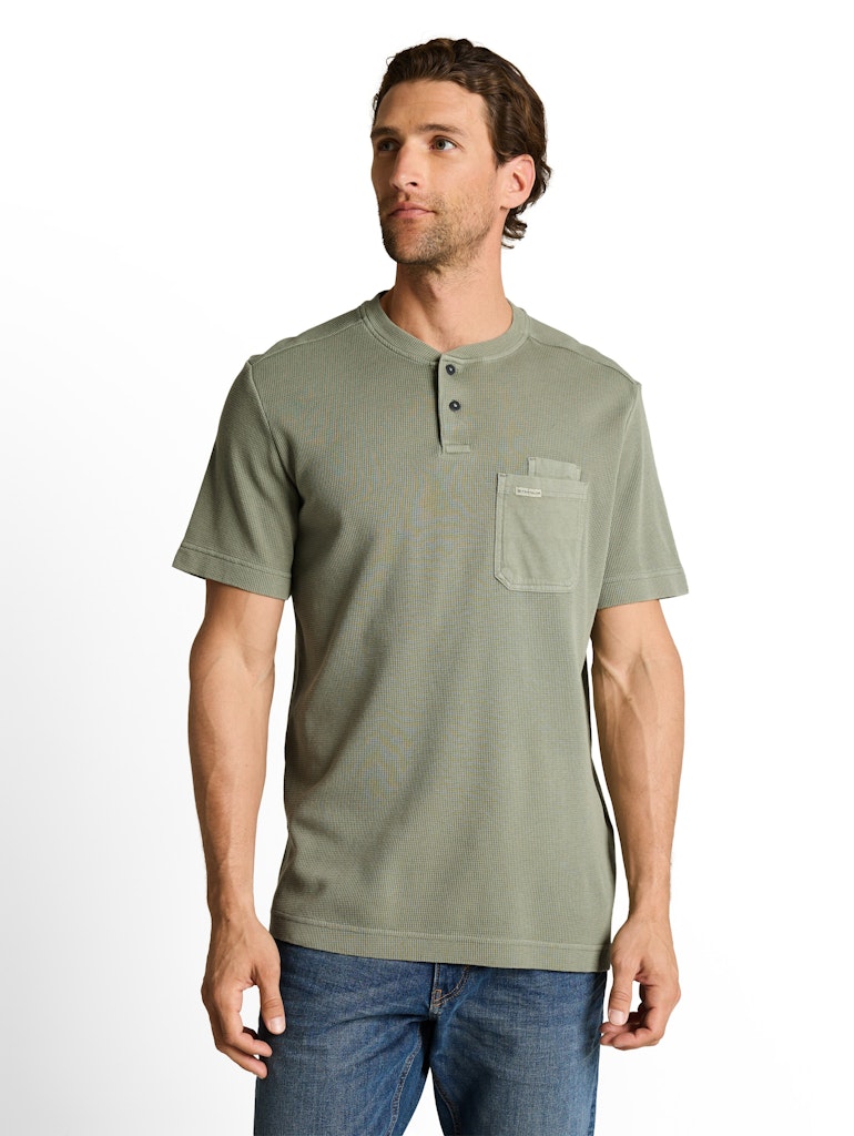 Henley T-Shirt mit Knopfleiste am Kragen und aufgesetzter Brusttasche. Mit Garment-Dye-Effekt für einen Used-Look. Aus einem strukturierten Material in Waffel-Optik.