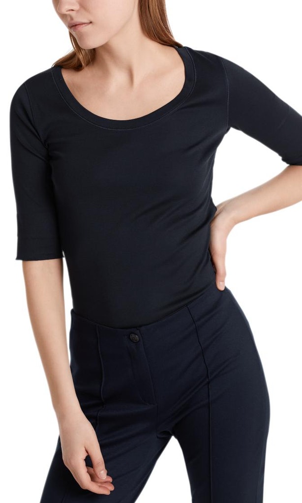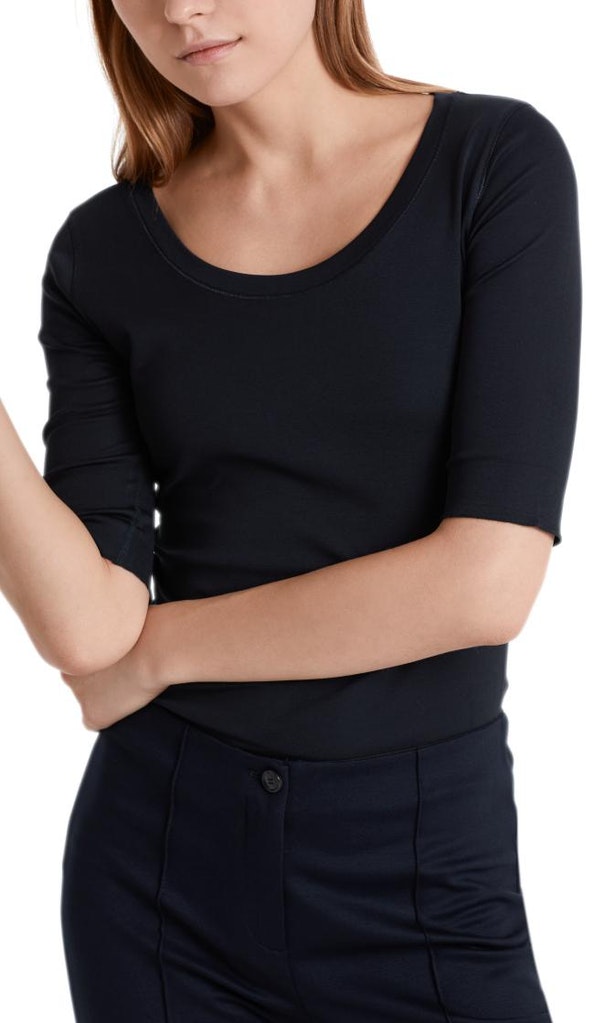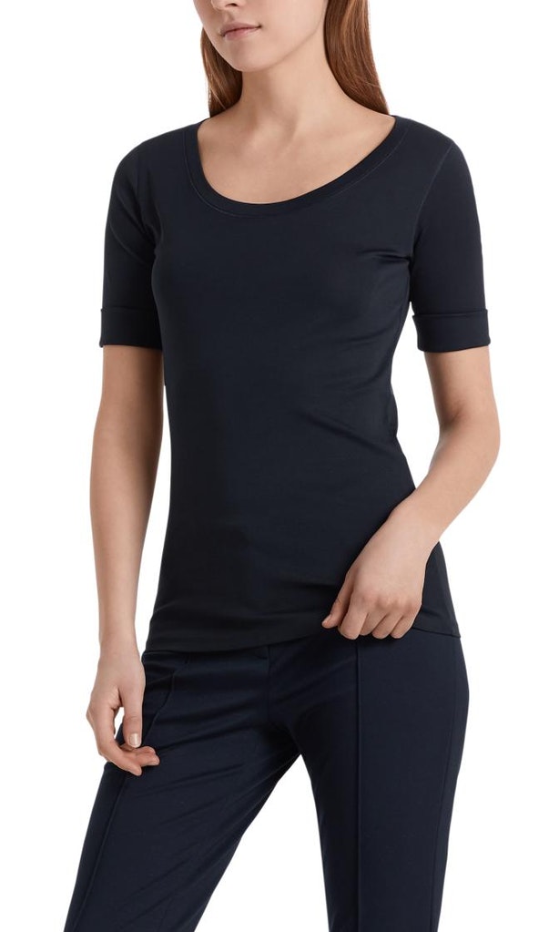 Hochwertiges Basic-Shirt|Ein simpler Style in feinster Qualität: das cleane Shirt mit halben Ärmeln und weitem Rundhals-Ausschnitt. Die weiche Baumwolle plus Elasthananteil und die anspruchsvolle Verarbeitung entsprechen höchsten Ansprüchen. Für einen schönen Akzent sorgt der applizierte Schmuckstein vorne über dem Saum.|Farbe: midnight blue|Leichte Baumwoll-Elasthan Mischung|Dezent taillierter Schnitt|Das Model ist 179 cm groß und trägt N3/38.|Inside-Out-Nähte am abgesetzten Ausschnitt und den Armlochnähten