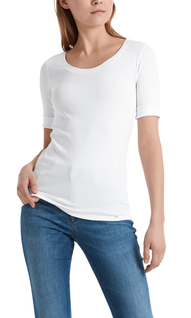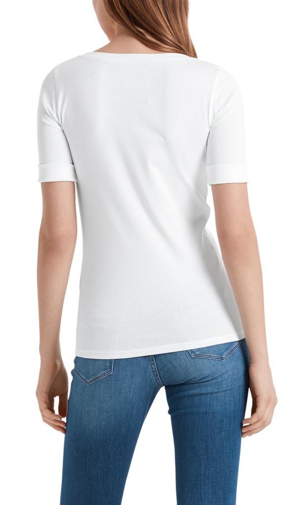 Hochwertiges Basic-Shirt|Ein simpler Style in feinster Qualität: das cleane Shirt mit halben Ärmeln und weitem Rundhals-Ausschnitt. Die weiche Baumwolle plus Elasthananteil und die anspruchsvolle Verarbeitung entsprechen höchsten Ansprüchen. Für einen schönen Akzent sorgt der applizierte Schmuckstein vorne über dem Saum.|Farbe: midnight blue|Leichte Baumwoll-Elasthan Mischung|Dezent taillierter Schnitt|Das Model ist 179 cm groß und trägt N3/38.|Inside-Out-Nähte am abgesetzten Ausschnitt und den Armlochnähten