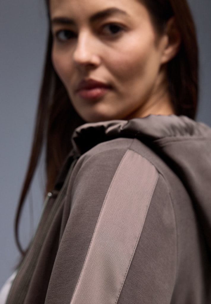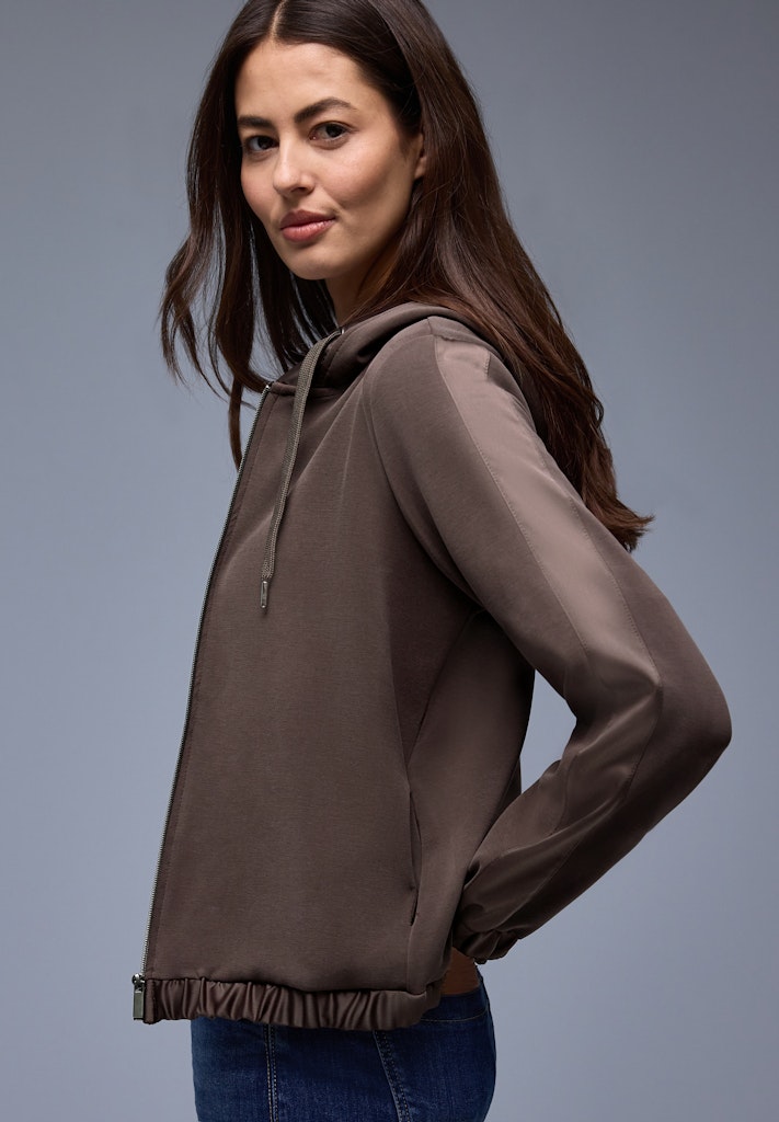 Diese Hoodie-Jacke von Street One für Damen vereint sportiven Style mit einem edlen Silk-Look. Der seidige Glanz, elastische Bündchen im Satin-Look und die Kapuze mit Tunnelzug machen sie zu einem stilvollen Begleiter im Alltag. Ein Reißverschluss rundet das Design ab – perfekt für gemütliche und moderne Layering-Outfits. Silk-Look Jacke Casual Kapuze Langarm Seidiger Glanz Material: 46% Modal, 46% Polyester, 8% Elasthan