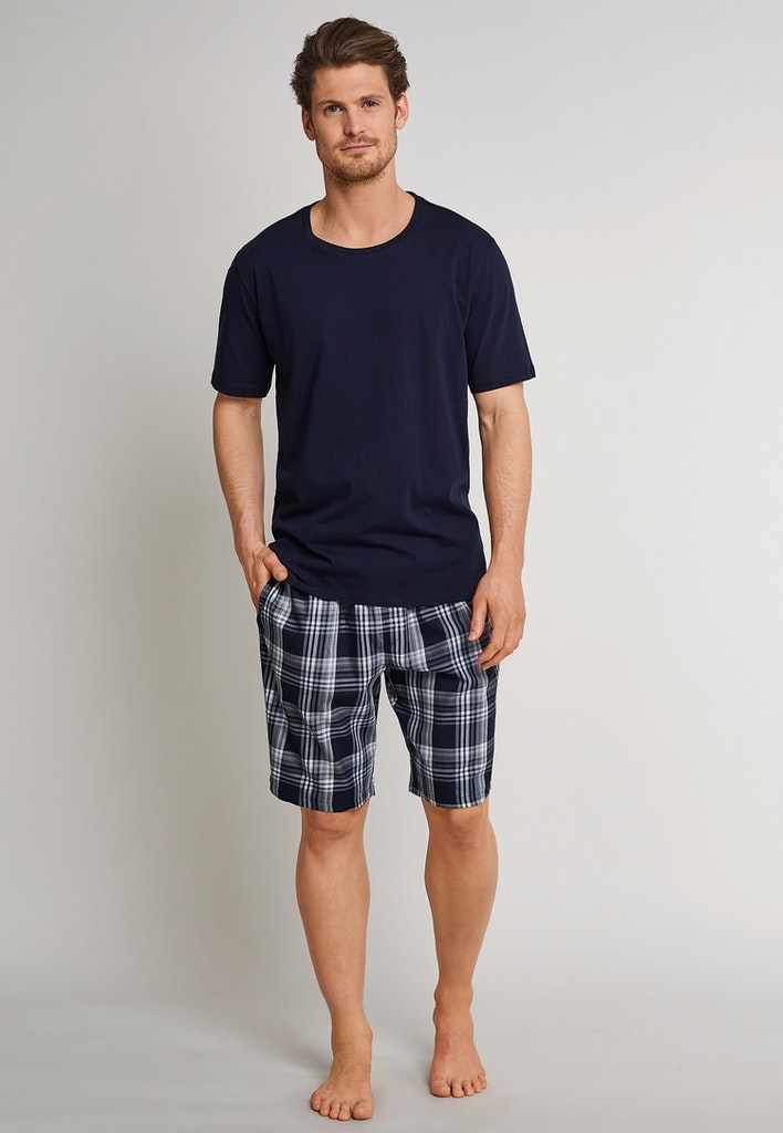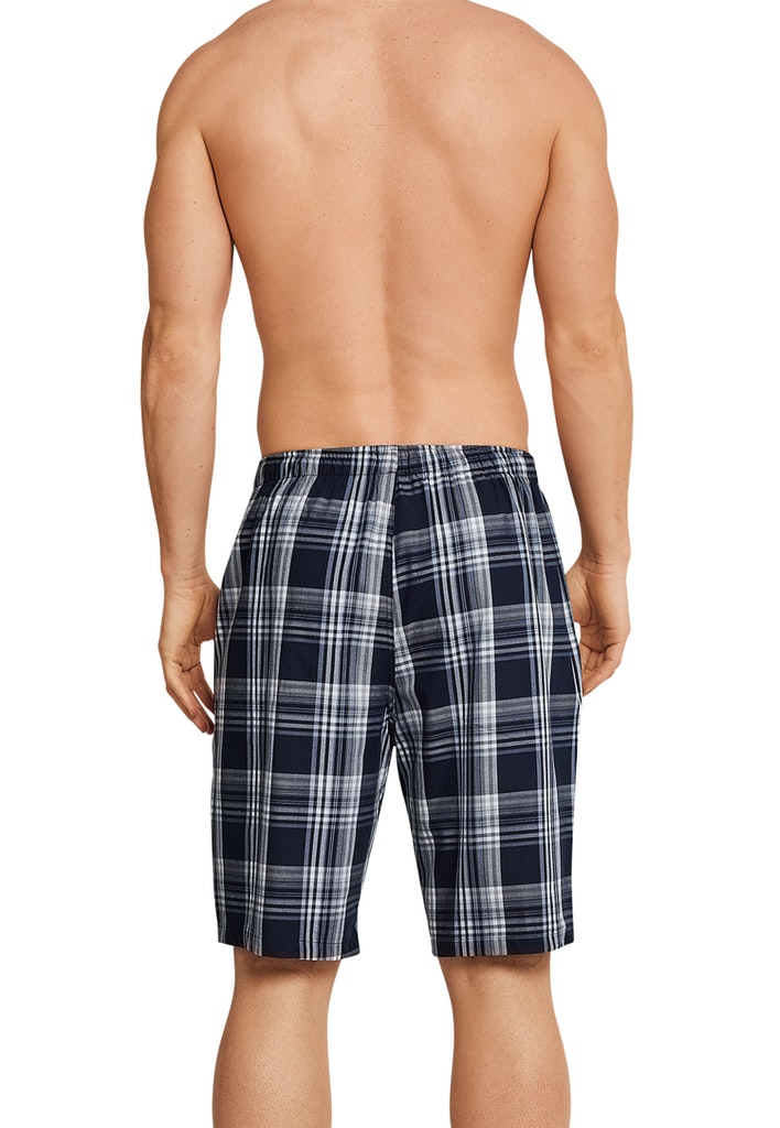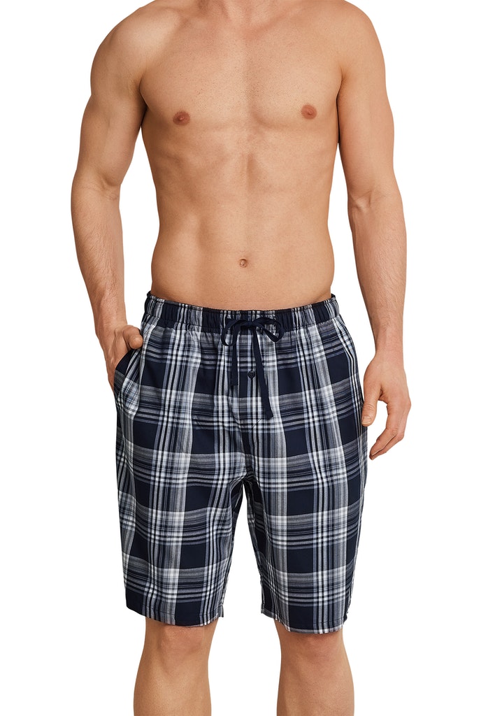Ein Karo-Muster in Dunkelblau, Hellblau und Weiß macht diese Herren-Long-Boxer zum stilvollen Relax-Partner! In lockerer Passform und aus 100 % fein gewebter Baumwolle bieten die Shorts hohen Tragekomfort und sind mit seitlichen Eingrifftaschen ausgestattet. Das dunkelblaue Bindeband am elastischen Bund sowie die funktionale Knopfleiste komplettieren den maskulinen Look. Ideal für entspannte Tage und Nächte!