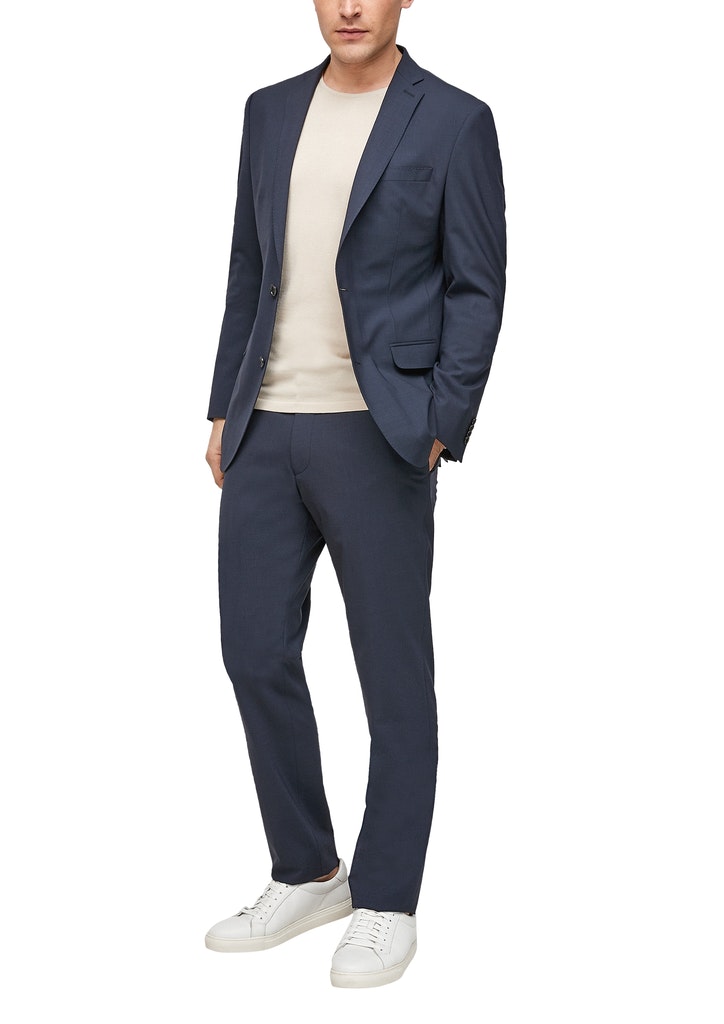 Oberstoff: 52% Polyester, 43% Schurwolle, 5% Elasthan; Futter: 100% Polyester