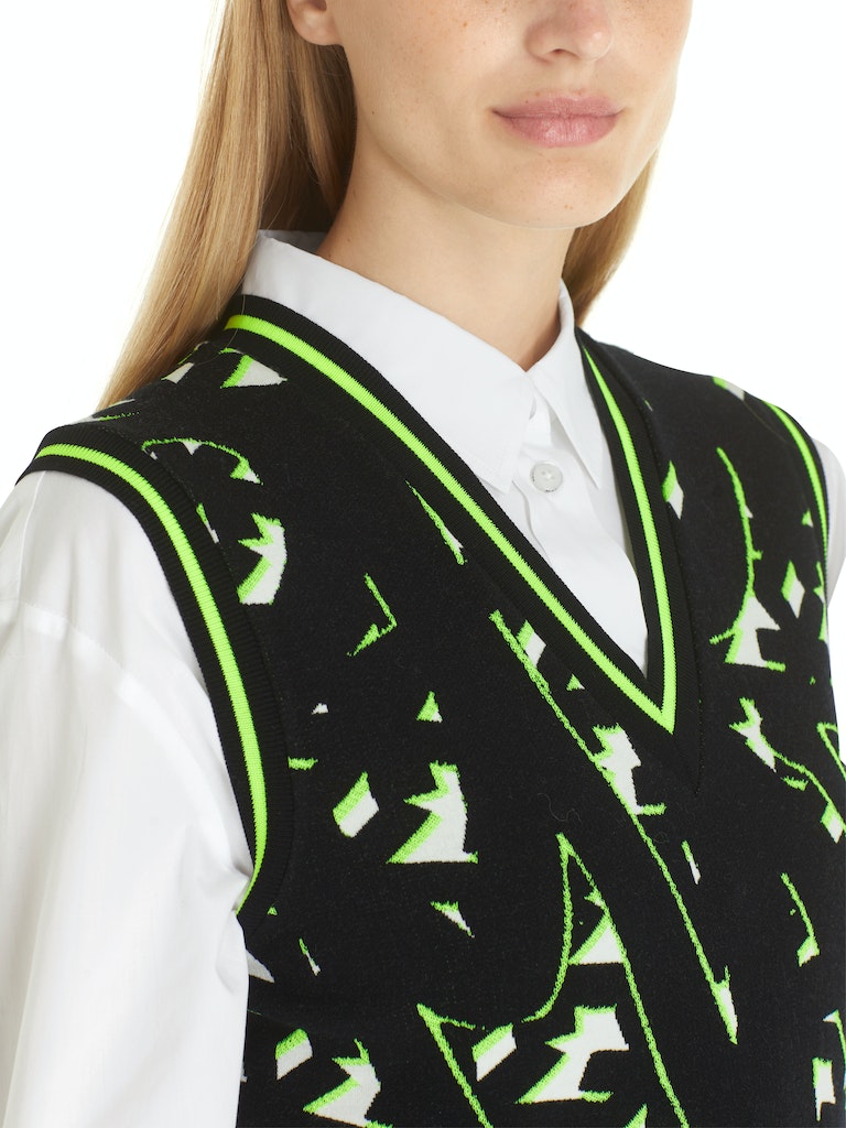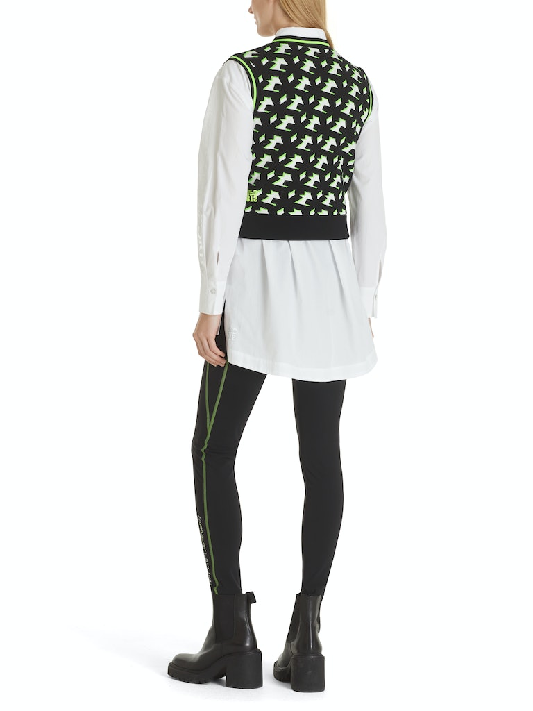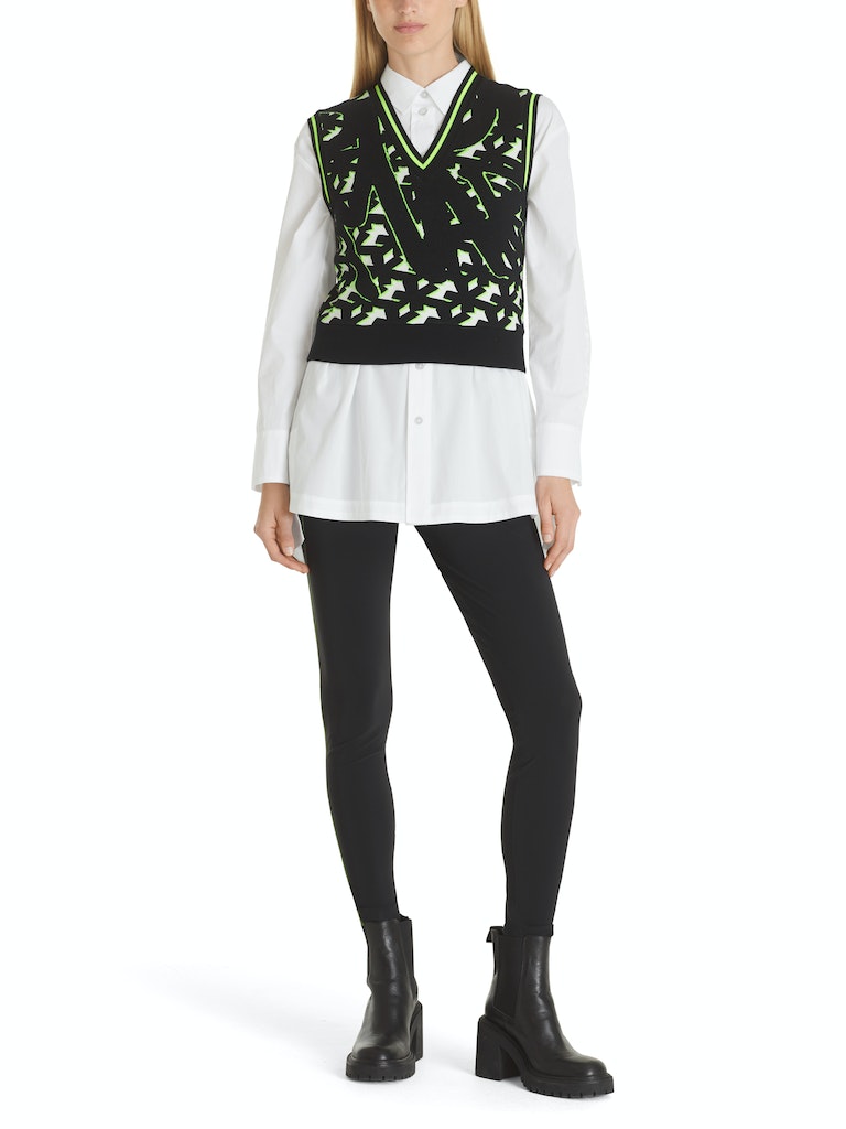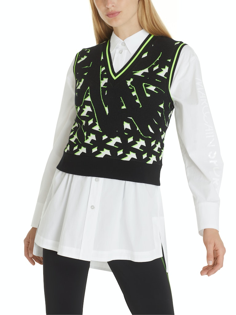 In Deutschland gestrickter Pullunder|Sportiver Pullunder aus Viskosestretch mit grafischem Muster. Das Modell ist auch "Knitted in Germany": Das Verstricken der Garne auf hochmodernen Strickmaschinen und die Veredelung der Stoffe geschehen in Deutschland. Zusammengenäht werden die Teile in europäischen Partnerbetrieben.|Farbe: white and black|Leger geschnitten|Mit V-Ausschnitt|Das Model ist 179 cm groß und trägt N3/38.|Ringel am Ausschnitt||||