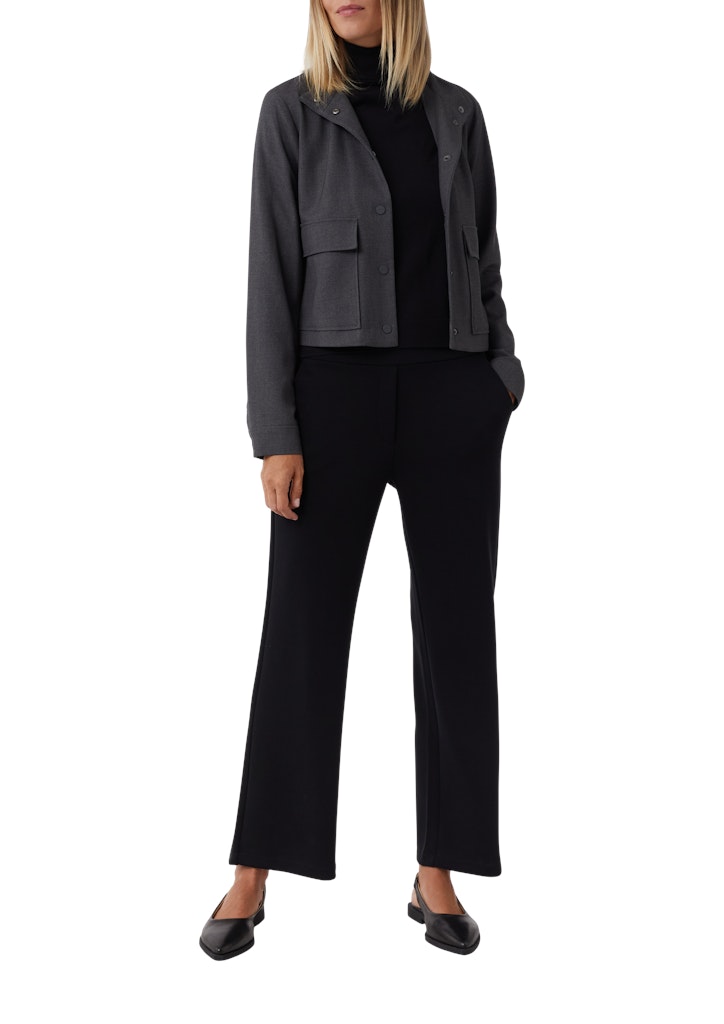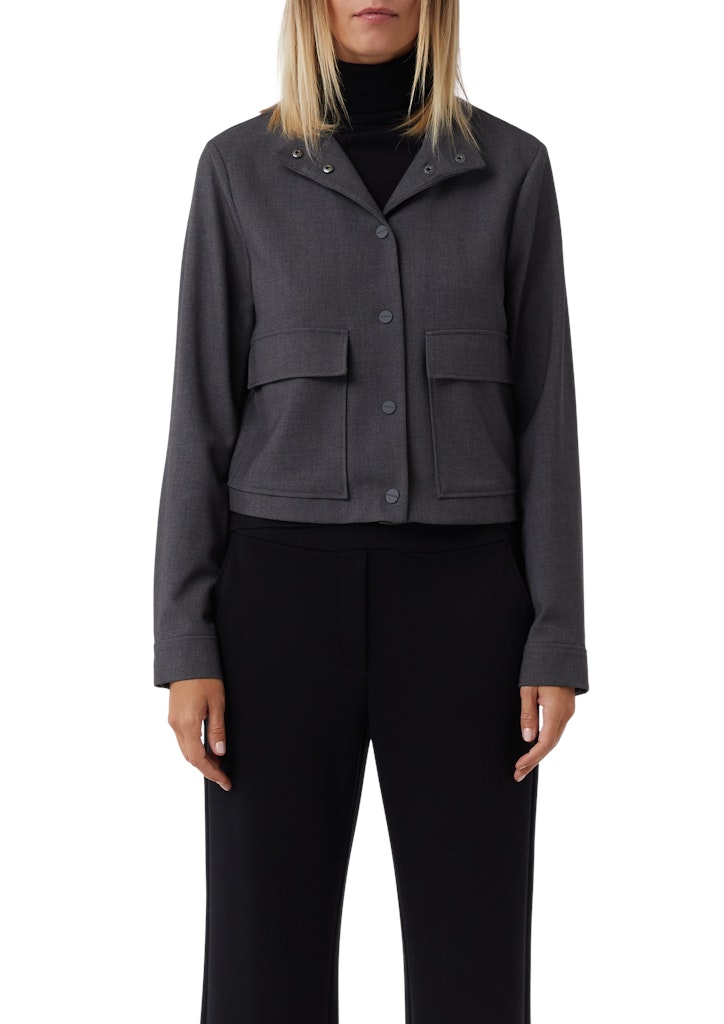 Diese kurze Jacke vereint Business-Eleganz mit lässigem Casual-Chic. Der kurze, boxige Schnitt und der markante Stehkragen setzen modische Akzente, während die praktischen aufgesetzten Taschen Funktionalität garantieren. Die ungefütterte Webware und die stilvollen Manschetten machen die Jacke zum vielseitigen Begleiter. Mit Druckknopfverschluss ausgestattet, lässt sich dieses hochwertige Piece mühelos mit verschiedenen Outfits kombinieren.