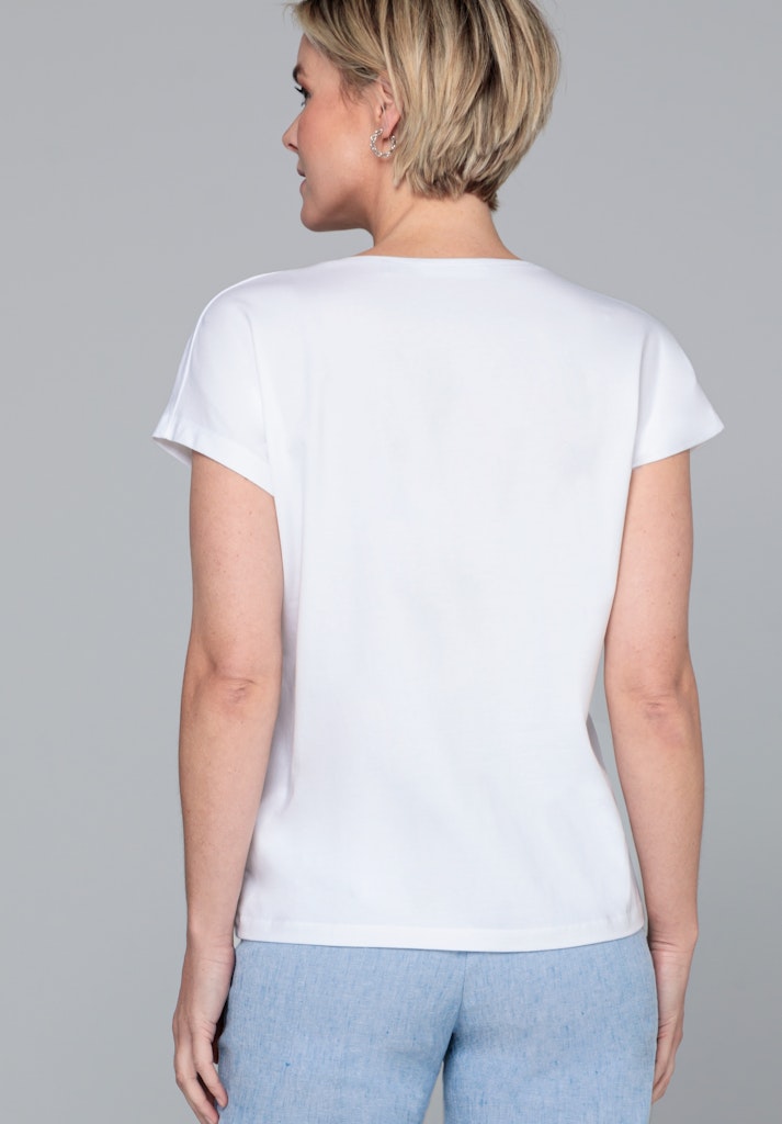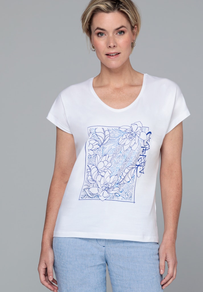 Das perfekte Shirt für ihre Sommergarderobe! Unser neues Print-Shirt Julie mit seinem tollen Frontmotiv ist ein modisches und lässiges Modell für viele Anlässe, ob im Alltag oder im Beruf. Mit kurzen überschnittenen Ärmeln und einem abgerundeten V-Neck bietet es einen modernen Look. Der gerade lockere Schnitt und die hochwertige Baumwolle mit Elasthan sorgen für eine bequeme Passform. Damit Julie ist ein Must-have für jeden Kleiderschrank!