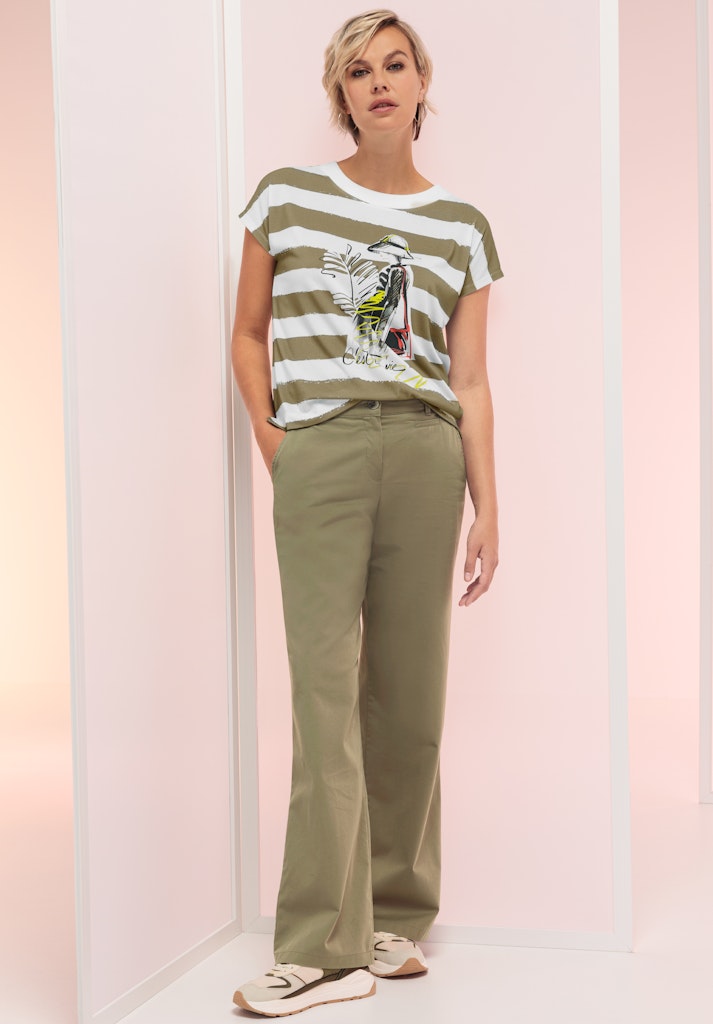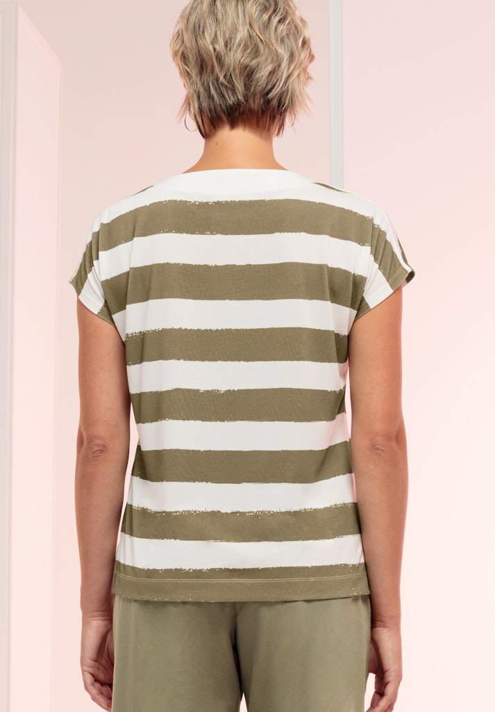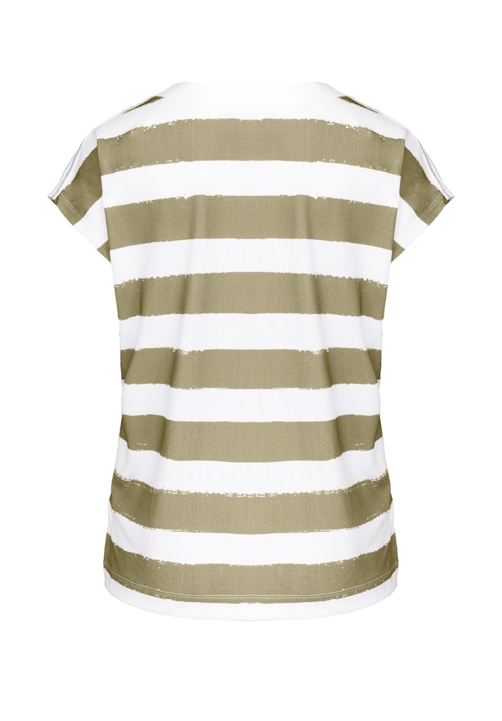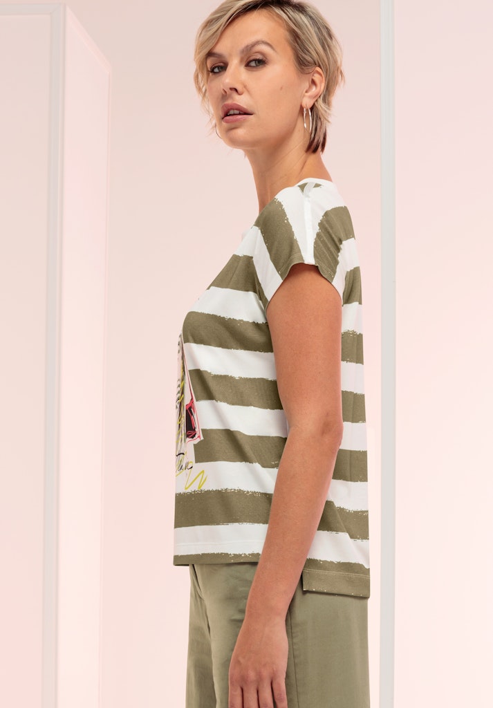 Ein echtes Lieblingsstück für jeden Tag! Unser Rundhalsshirt Julie überzeugt mit modischem Streifen-Design und einem auffälligen Frontmotiv. Die kontrastige Blende am Ausschnitt, die überschnittenen Schultern und die seitlichen Schlitze verleihen dem Shirt eine lässige Note. Hinten etwas länger geschnitten und mit lockerer Passform sorgt es für ein angenehmes Tragegefühl. Der hochwertige Materialmix mit Elasthan garantiert zudem besten Komfort und Bewegungsfreiheit. Ob casual zu Jeans und Sneakern oder etwas schicker mit weißer Hose und Loafern - Julie passt zu vielen Looks.