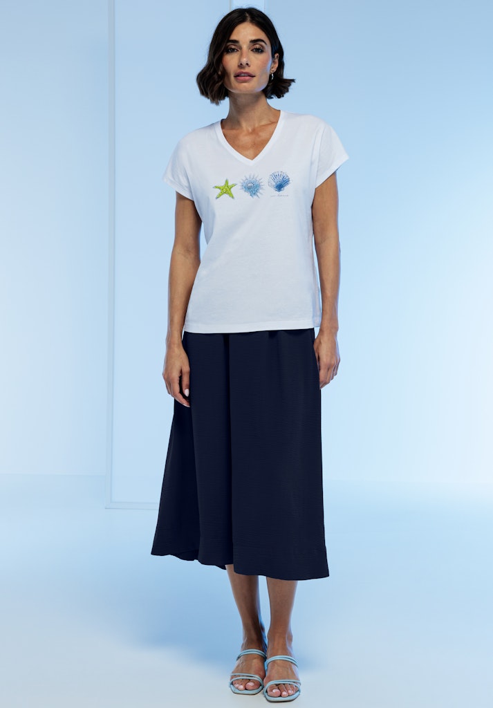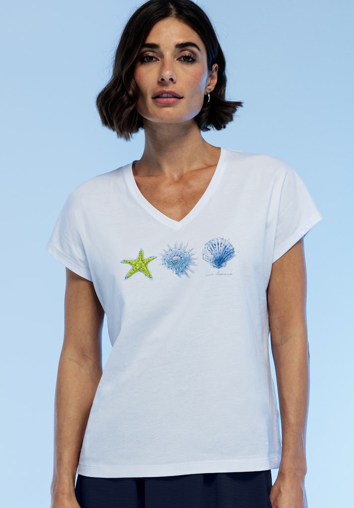 Unser neues Print-Shirt Julie bringt frischen Style in Ihre Sommergarderobe! Mit V-Ausschnitt, überschnittener Schulter und einem maritimen Frontprint mit dezenten Metallic-Details setzt es ein modisches Statement. Der weiche Baumwollmix mit Elasthan fühlt sich angenehm an und die lockere Passform sorgt für lässigen Komfort. Ob casual mit Jeans und Sneakern oder smarter mit Blazer und Loafern - Julie lässt sich vielseitig kombinieren.