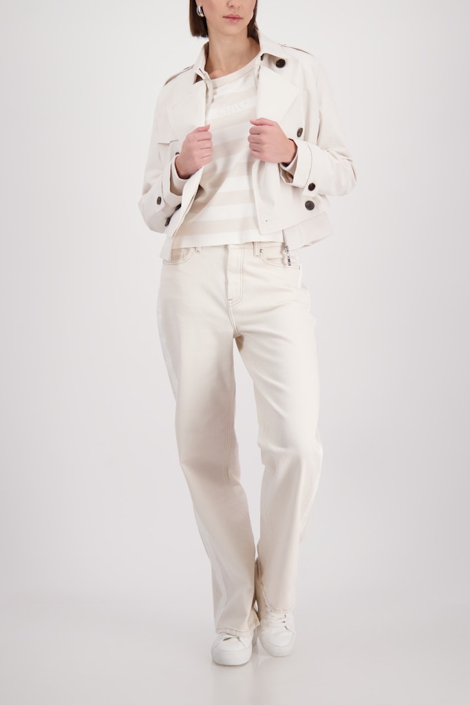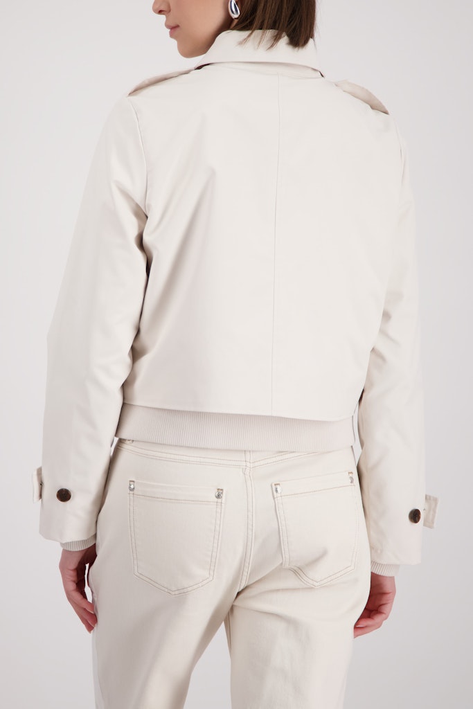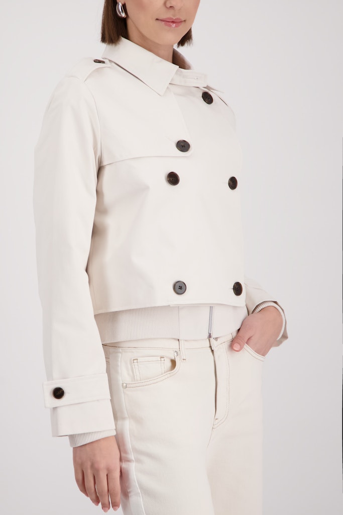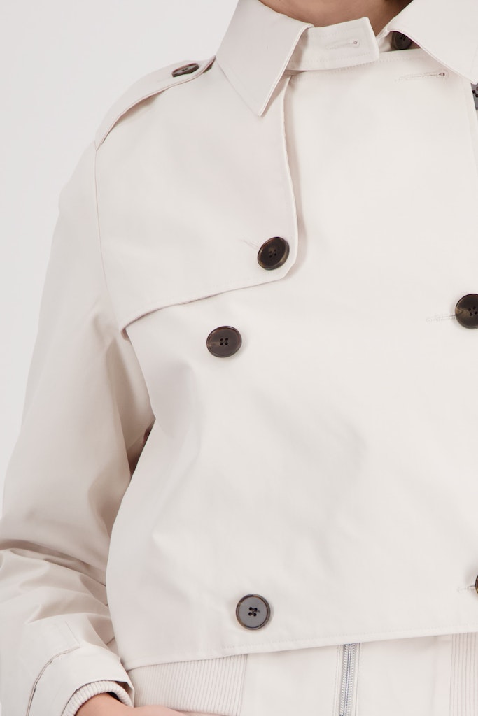 Ein stilvoller, kurzer Trenchcoat mit Hemdkragen und den typischen Schulterklappen für moderne Auftritte.