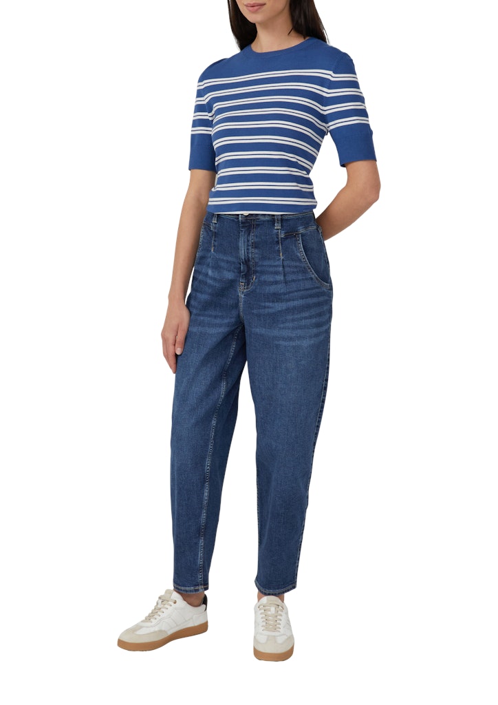 Unser Herzensprojekt: 360° Denim. Eine nachhaltigere Kapsel und ein nächster Schritt Richtung Kreislauffähigkeit. Jedes Piece besteht zu 98 Prozent aus Baumwolle, die zu mindestens 20 Prozent recycelt ist. Für eine bessere Recyclingfähigkeit ist der Anteil an synthetischen Fasern so gering wie möglich gehalten. Schwer recycelbare Nieten und Buttons? Nicht hier! Wir benutzen stattdessen modische Stickereien und abschraubbare Knöpfe, um Metallkomponenten zu reduzieren. Dazu verwenden wir in der Veredelungsstufe innovative Verfahren, die Ressourcen sparen können.