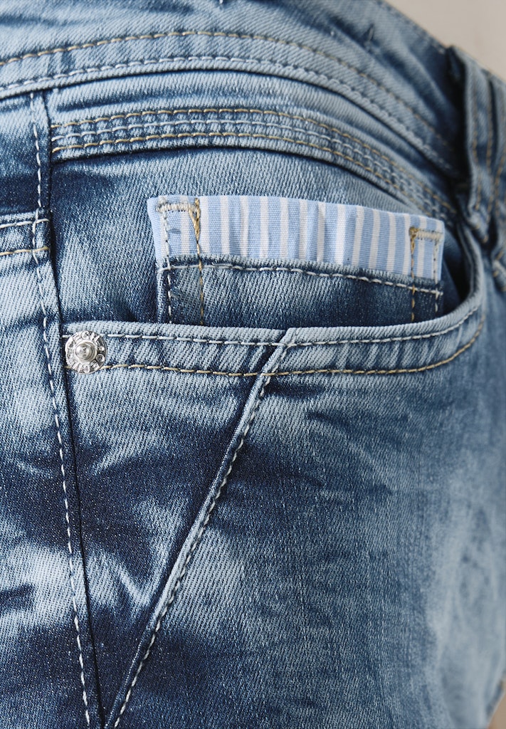 Diese Jeanshose von CECIL für Damen punktet mit einem gestreiften Turn-Up Detail und einer modernen Mid-Waist-Passform. Die Straight Legs sorgen für eine klassische Silhouette. Die blaue Waschung verleiht ihr eine vielseitige Optik. Jeanshose im Casual Fit Mid Waist und Straight Legs Gestreiftes Turn-Up Dateil Blaue Waschung Baumwollmix mit Stretchanteil Material: 77% Baumwolle, 20% Polyester, 3% Elasthan