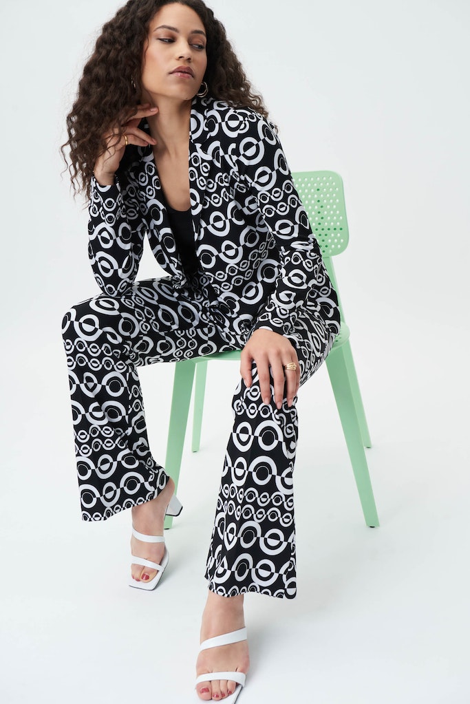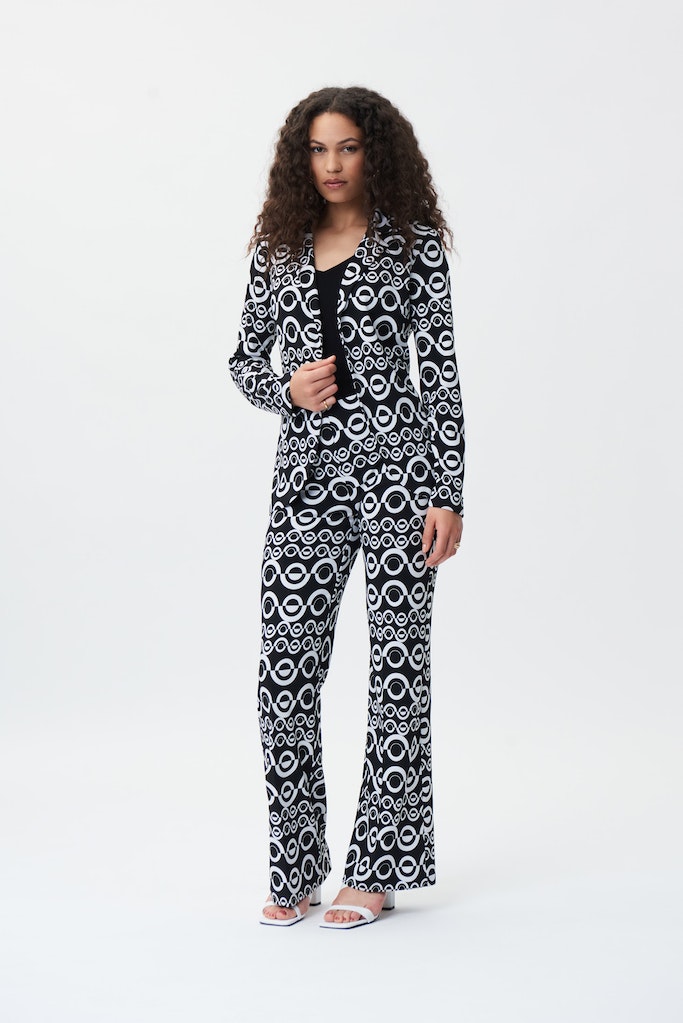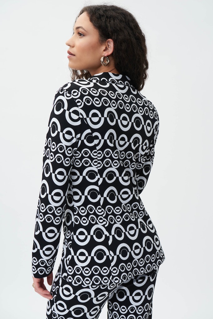 Der attraktive Jerseyblazer geometrischem Statementmuster findet die richtige Balance zwischen Komfort und Klasse und ist für das Businessmeeting wie auch für das Treffen mit Freunden gleichermaßen geeignet. Reverskragen, langer gerade geschnittener Arm.