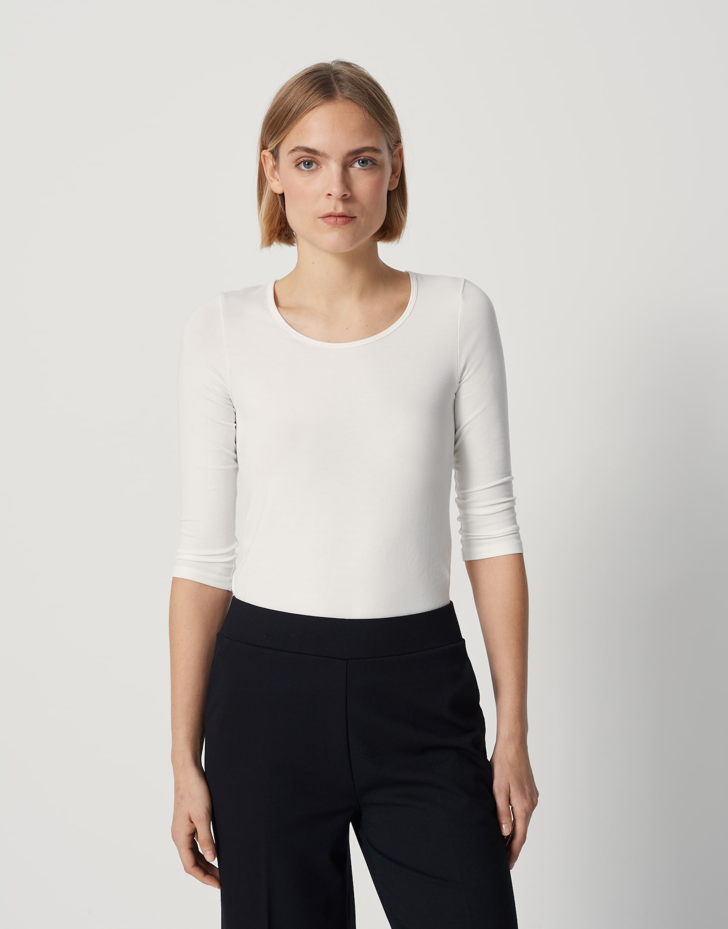 schmale Passform, figurbetont geschnitten, normale Länge, 3/4 Arm, Rundhalsausschnitt, Rückenlänge ca. 62,5 cm bei Größe 36, Modal Mix, Jersey, weicher Griff, Längsnaht hinten
