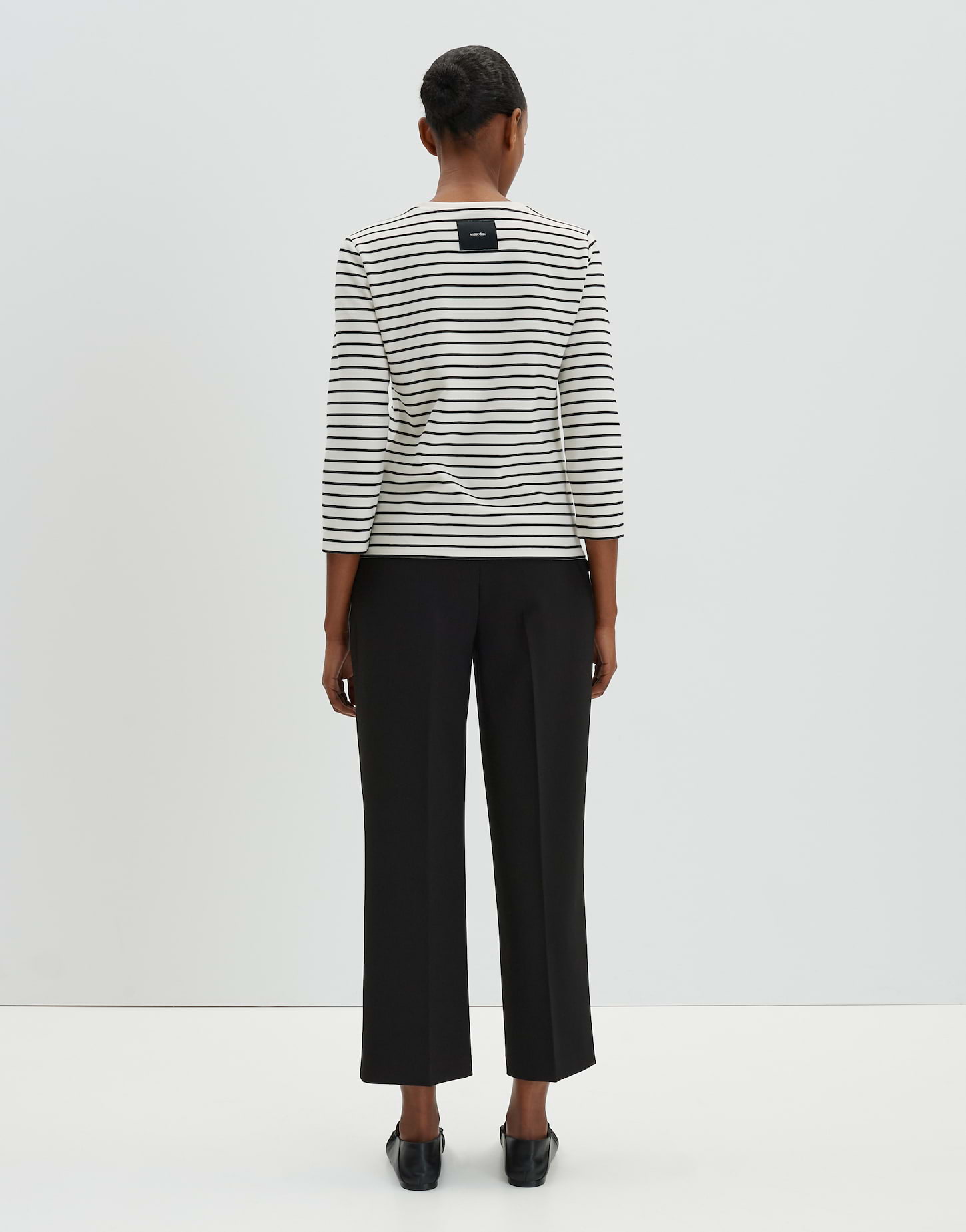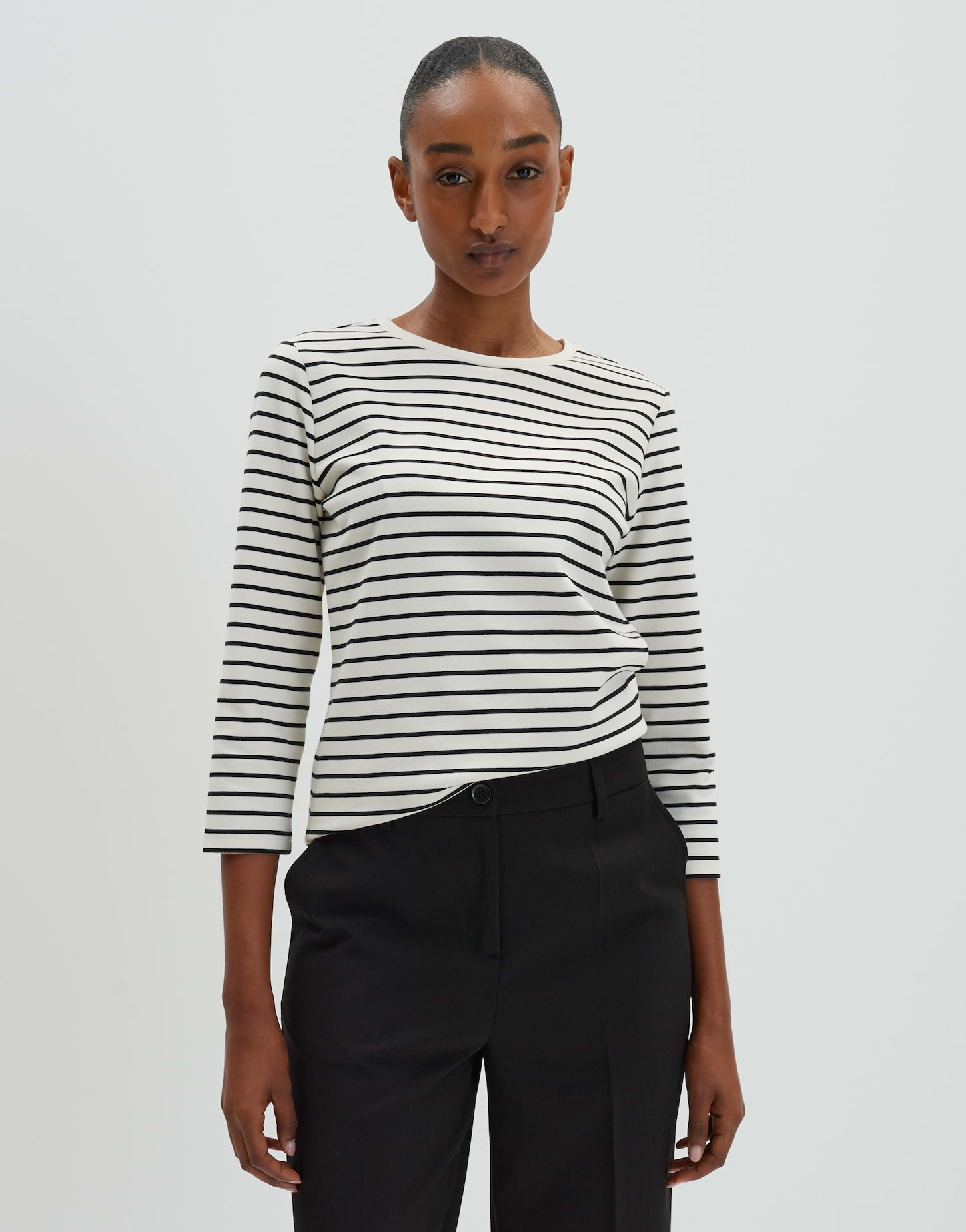 lockere Passform, gerader Schnitt, normale Länge, verkürzter Langarm, Rundhalsausschnitt, Rückenlänge ca. 58 cm in Größe 36, Model Größe 178 cm - trägt Größe 36, Webware, Jersey, weicher Griff, zweifarbiges Streifenmuster, Logo-Aufnäher im Nacken, Freizeit Anlass