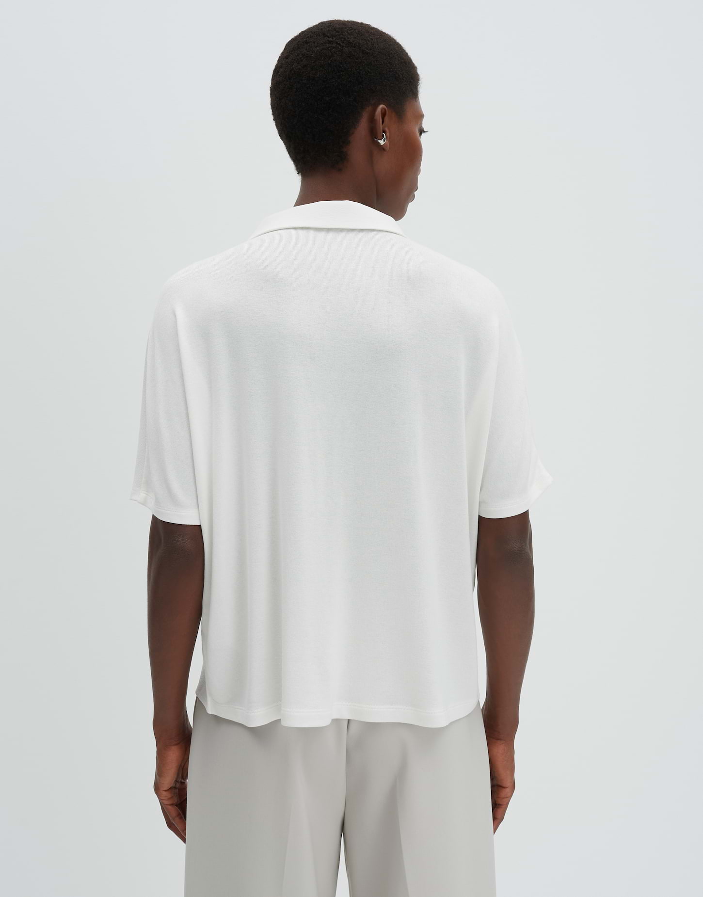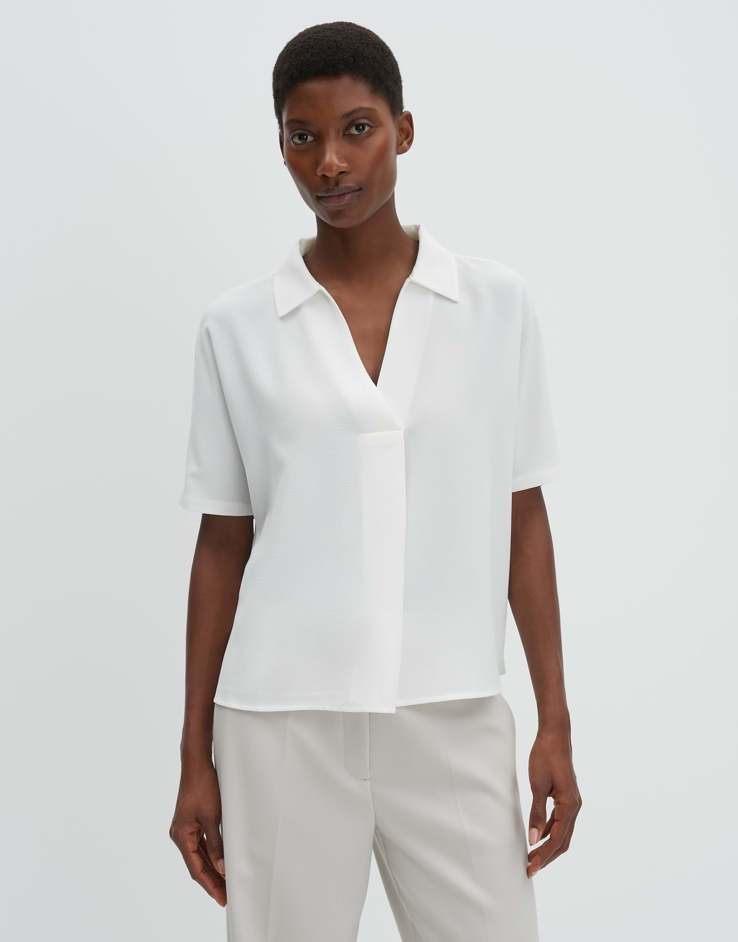 lockere Passform, gerader Schnitt, überschnittener Kurzarm, V-Ausschnitt, Polokragen, Rückenlänge ca. 57 cm bei Größe 36, Model Größe 176 cm - trägt Größe 36, Webware, Jersey im Rücken, dezente Struktur, weicher Griff, fließender Fall, leichte Transparenz im hellen Farbton, Falte vorne