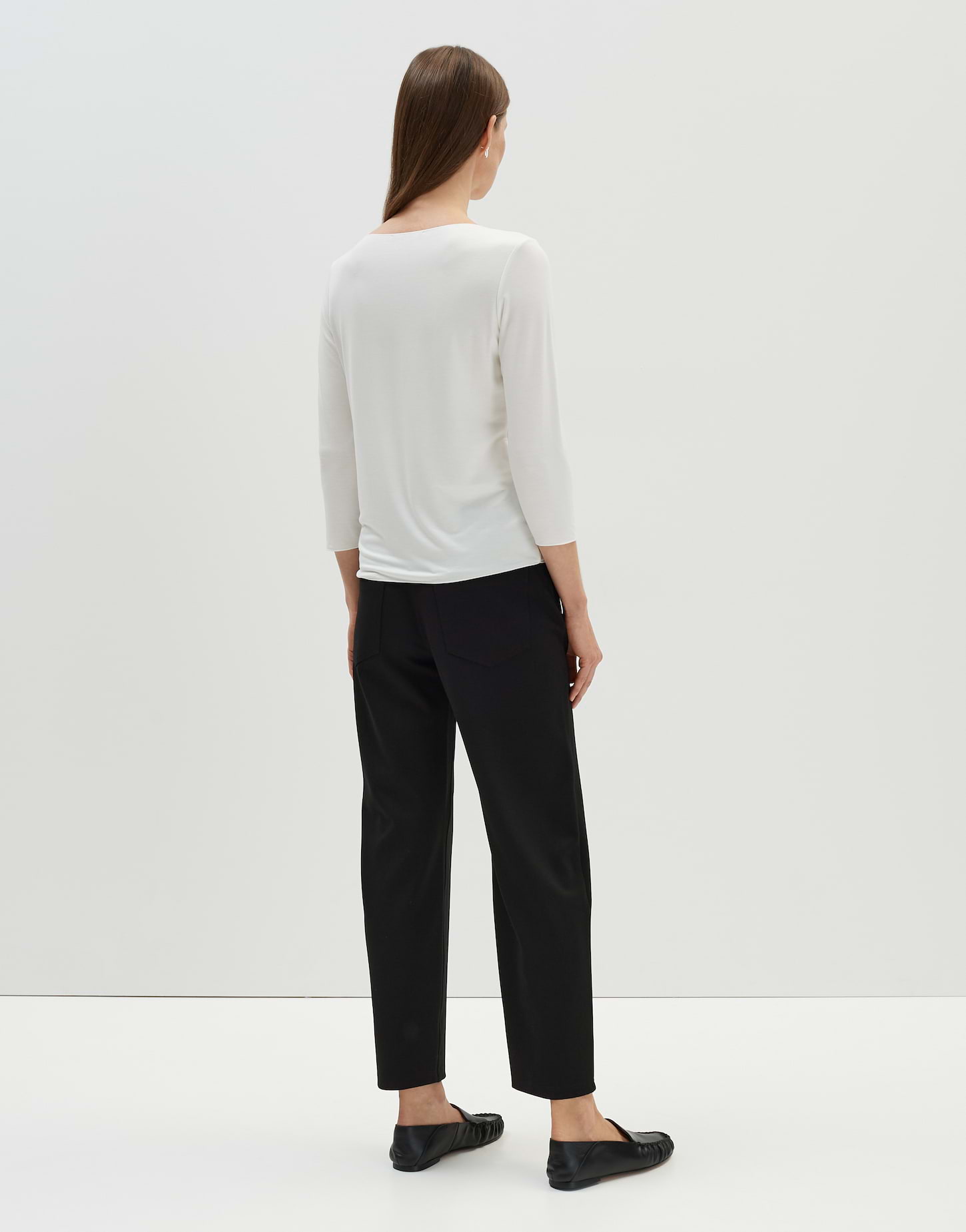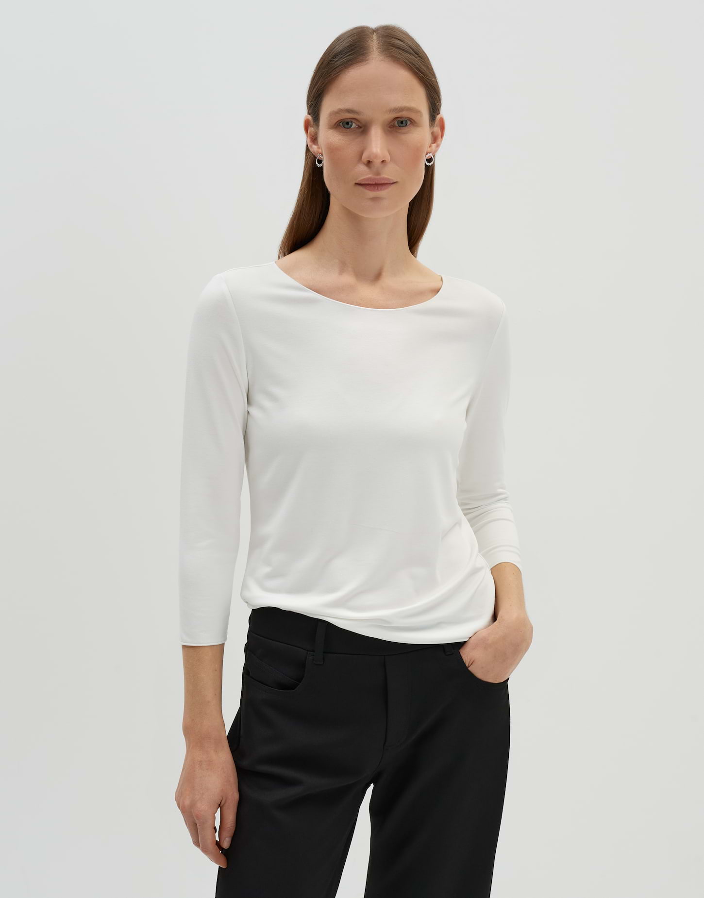 schmale Passform, gerader Schnitt, normale Länge, 3/4 Arm, weiter Rundhalsausschnitt, Rückenlänge ca. 56 cm bei Größe 36, Model Größe 179 cm - trägt Größe 36, ECOVEROT Viskose Mix, Jersey, weicher Griff, fließender Fall, Rollkanten