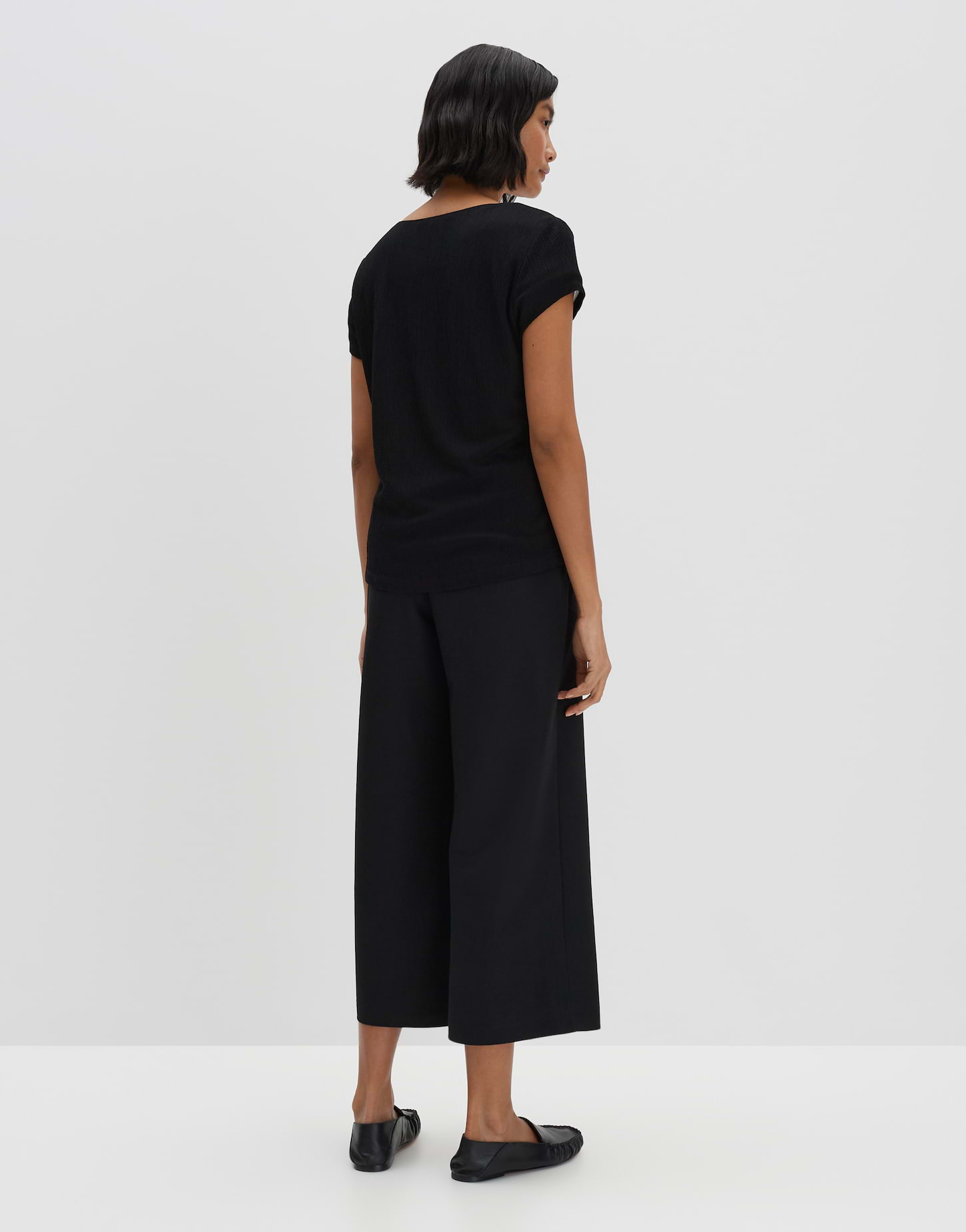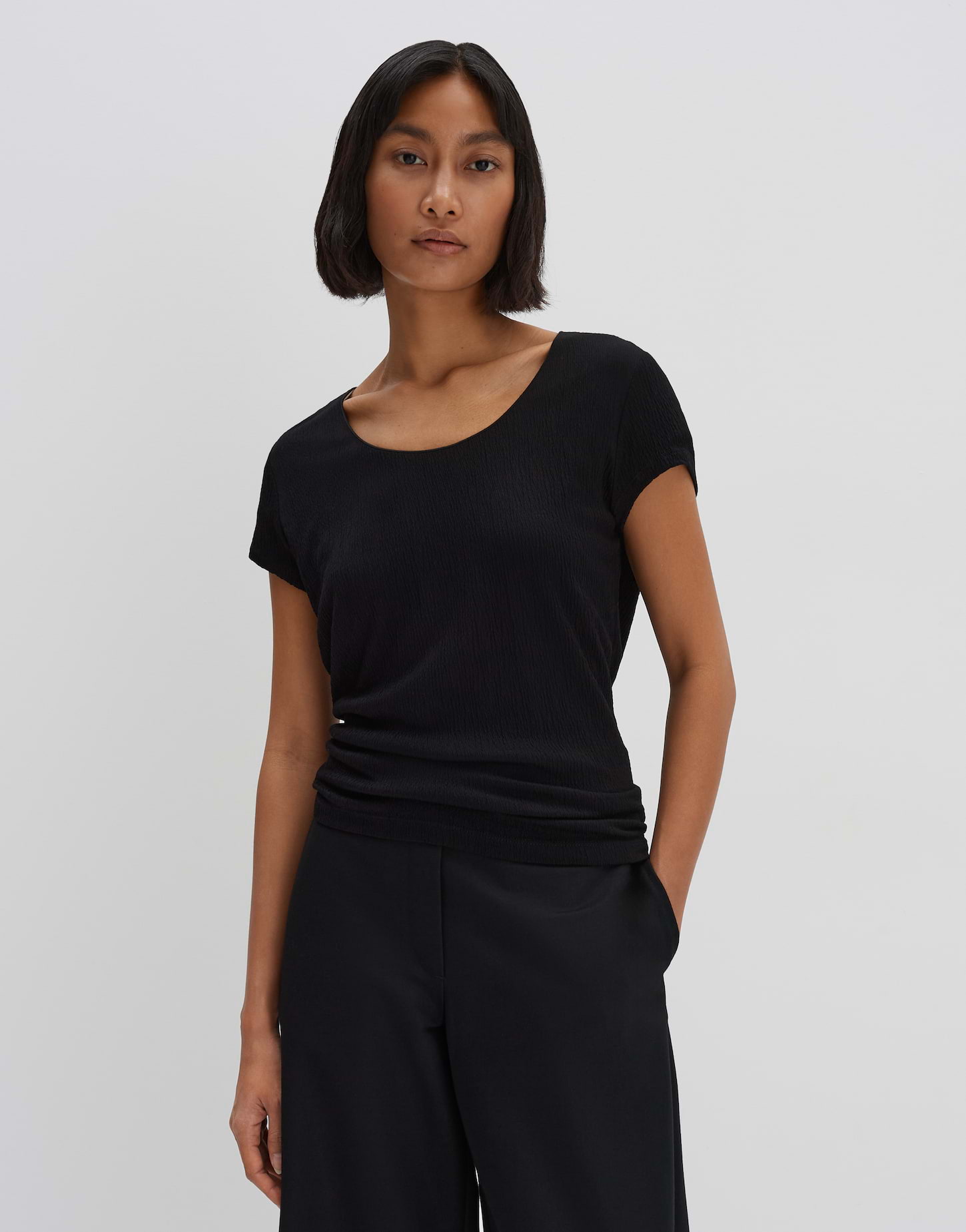 schmale Passform, figurbetont geschnitten, normale Länge, Kurzarm, tiefer Rundhalsausschnitt, Rückenlänge ca. 56 cm bei Größe 36, Model Größe 176 cm - trägt Größe 36, Jersey, Smok Effekt, elastischer Stoff
