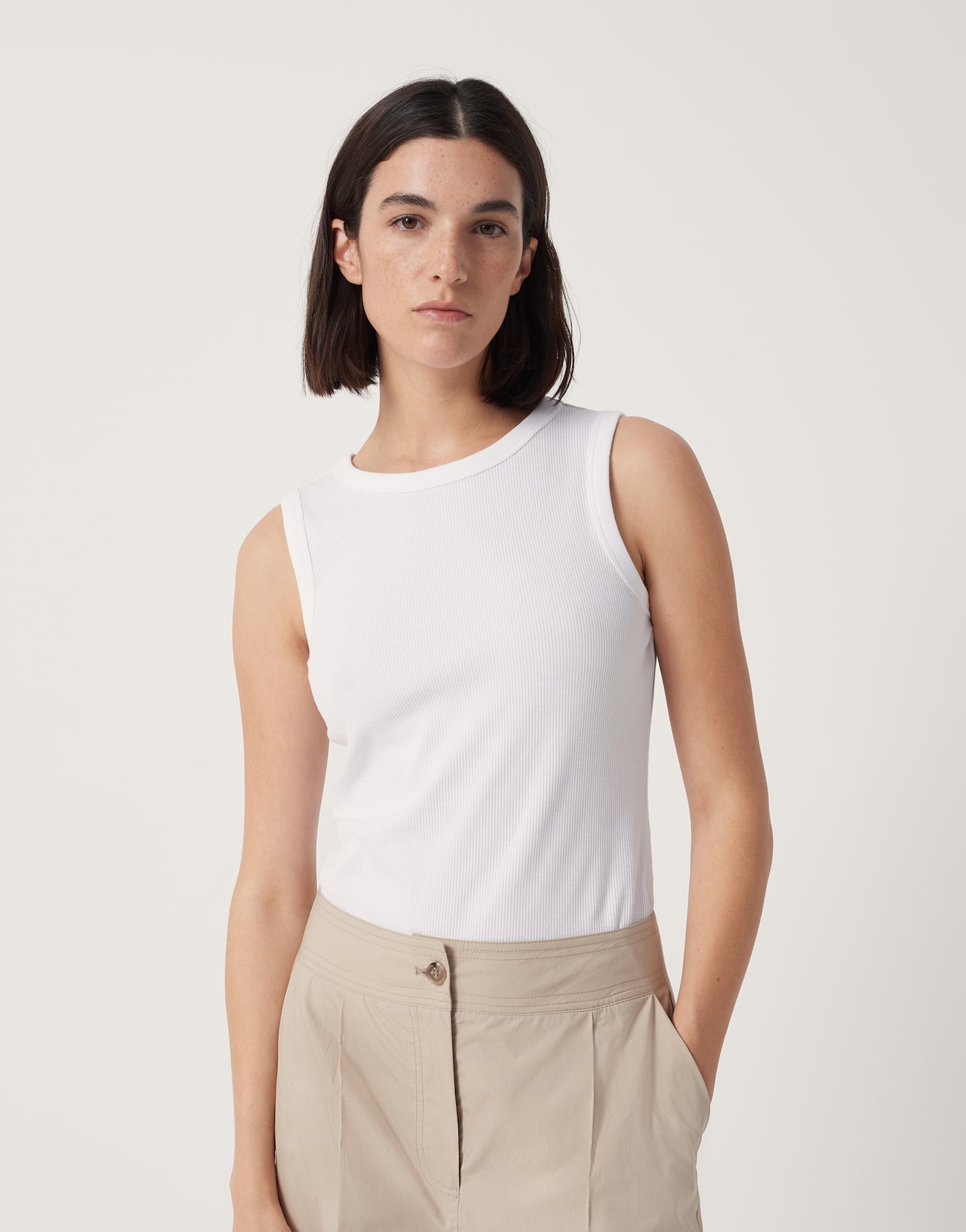 schmale Passform, figurbetont geschnitten, normale Länge, Nullarm, Rundhalsausschnitt, Rückenlänge ca. 60 cm bei Größe 36, BCI Cotton Mix, Jersey, Rippstruktur, elastischer Stoff