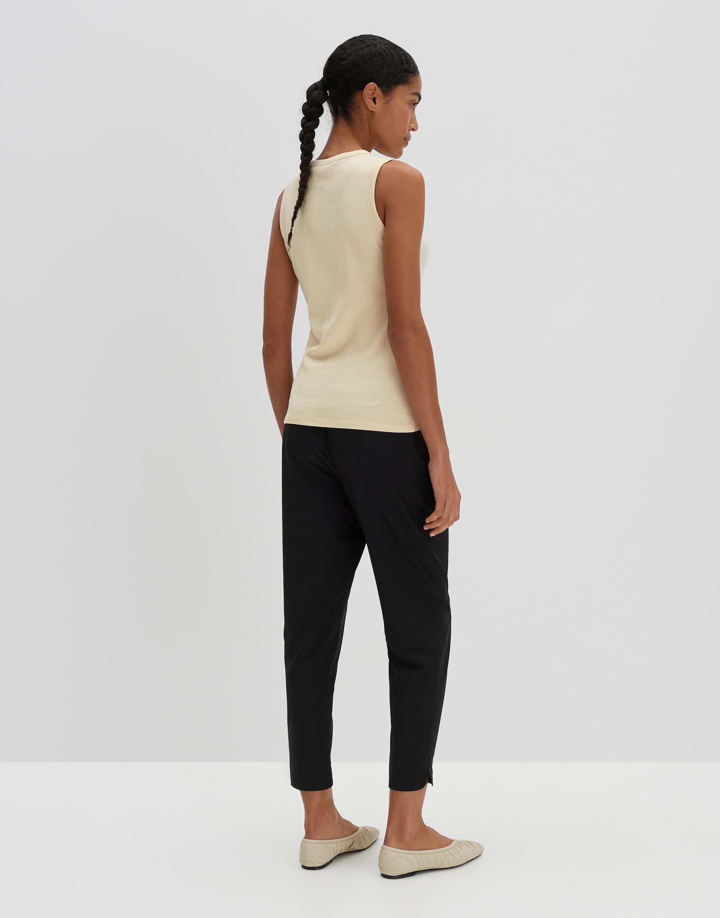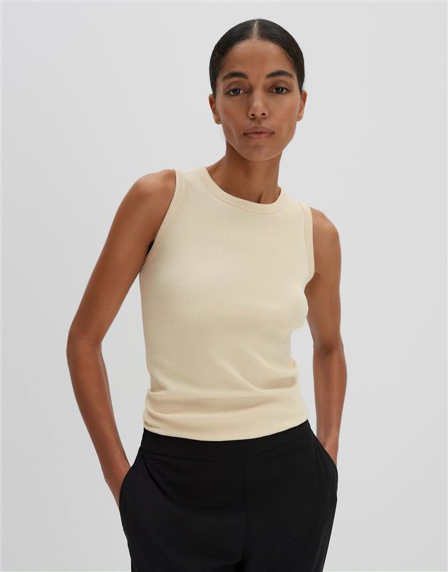 schmale Passform, figurbetont geschnitten, normale Länge, Nullarm, Rundhalsausschnitt, Rückenlänge ca. 60 cm bei Größe 36, Model Größe 179 cm - trägt Größe 36, BCI Cotton Mix, Jersey, Rippstruktur, elastischer Stoff