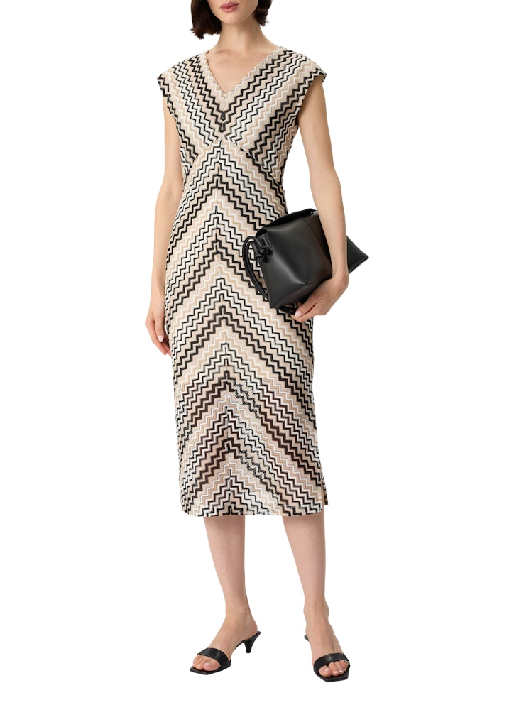 Zick-Zack-Zauber: Dieses ausgestellte Midikleid begeistert mit seinem raffinierten Ajourmuster. Der V-Ausschnitt und die überschnittenen Schultern verleihen Ihnen eine feminine Silhouette. Die taillierte Passform und der seitlich geschlitzte Saum sorgen für eine schmeichelnde Linie. Dank des verdeckten Reißverschlusses und des Jerseyfutters bietet es Ihnen höchsten Tragekomfort. Stylen Sie es mit Sandaletten für einen eleganten Auftritt oder mit Sneakers für einen lässigen Look.