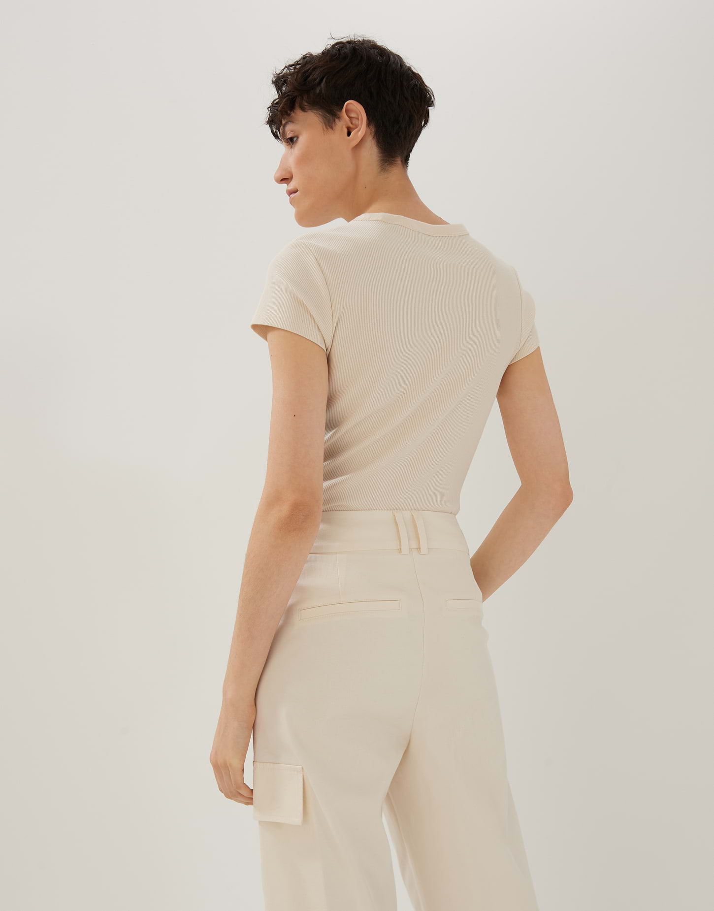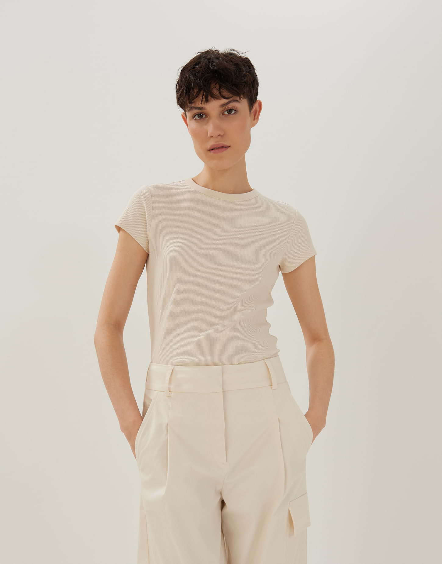 figurbetont geschnitten, normale Länge, Kurzarm, Rundhalsausschnitt, Rückenlänge ca. 60 cm bei Größe 36, schmale Passform, BCI Cotton Mix, Jersey, feine Rippstruktur, elastischer Stoff