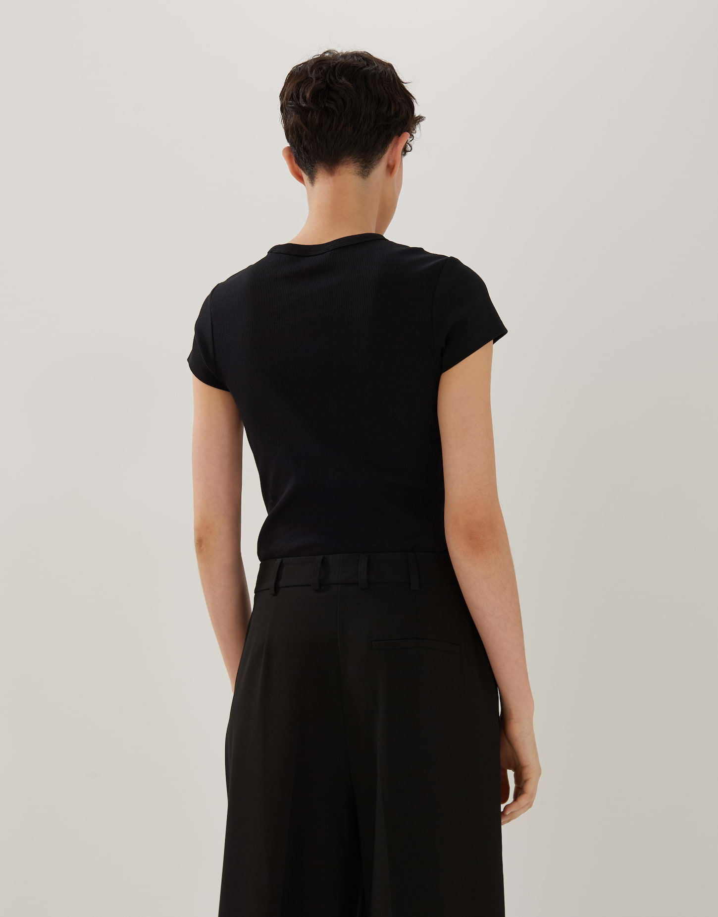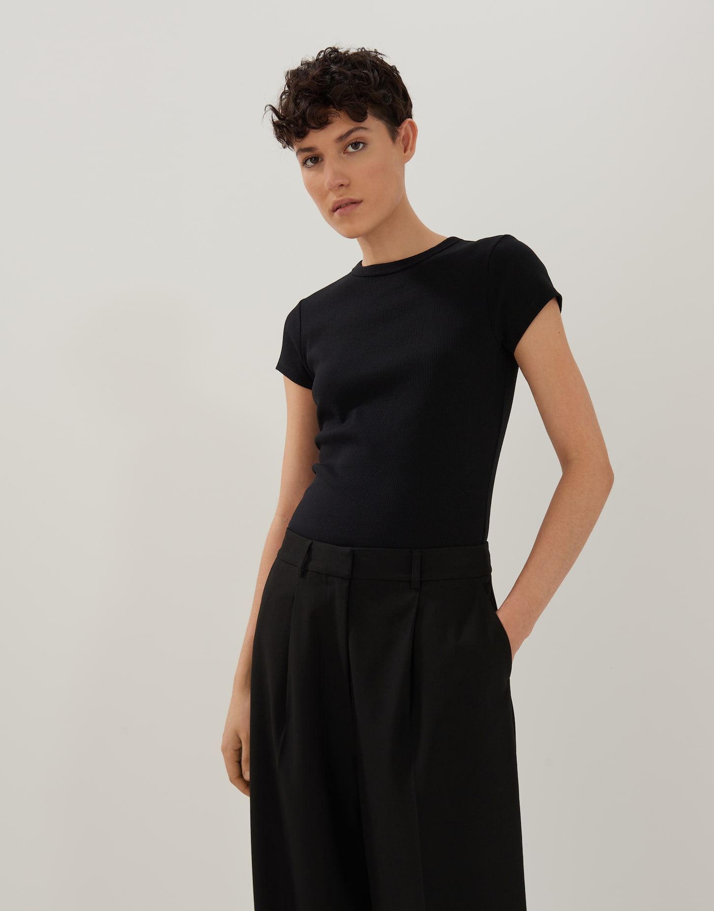 figurbetont geschnitten, normale Länge, Kurzarm, Rundhalsausschnitt, Rückenlänge ca. 60 cm bei Größe 36, schmale Passform, BCI Cotton Mix, Jersey, feine Rippstruktur, elastischer Stoff