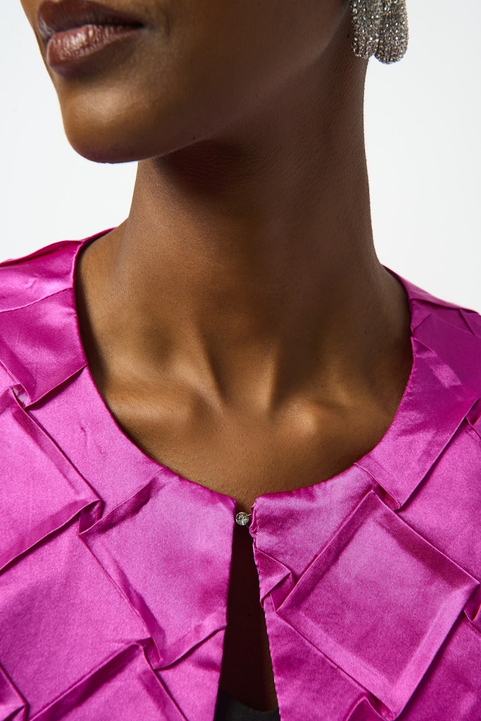 Verleihen Sie Ihrer Abendgarderobe einen Hauch von Farbe und Struktur mit unserer kragenlosen Jacke aus luxuriösem strukturiertem Satin. Mit einer eleganten, geraden Silhouette, verkürzter Länge und Dreiviertelärmeln lässt sich dieses vielseitige Modell wunderbar mit Kleidern, Röcken oder Hosen kombinieren. Der verzierte Haken- und Ösenverschluss am Halsausschnitt verleiht ihr ein raffiniertes, elegantes Finish und macht sie zu einer auffälligen Ergänzung Ihrer Garderobe.