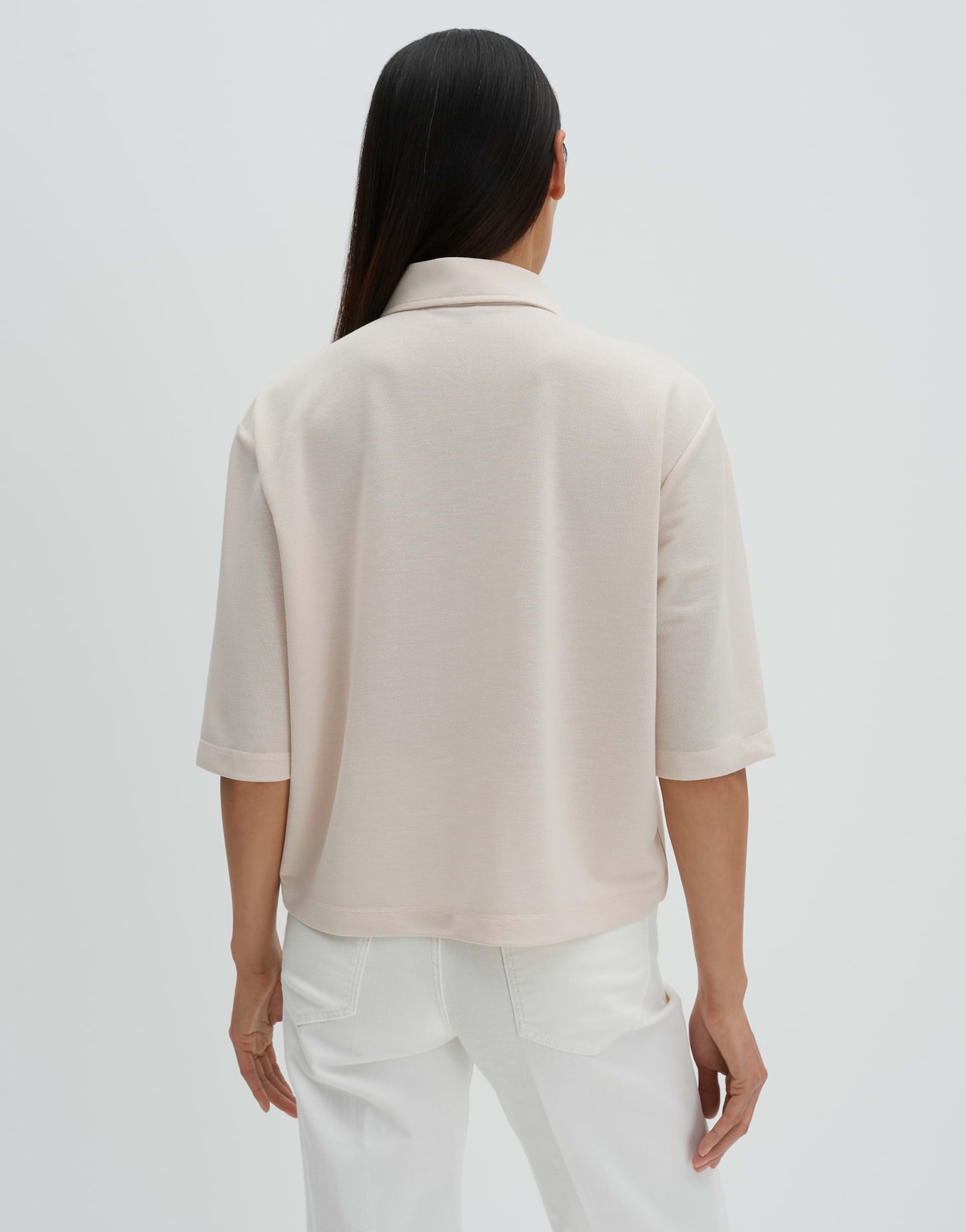 weite Passform, Boxy Silhouette, leicht verkürzt geschnitten, überschnittene Schulter mit Kurzarm, Hemdblusenkragen, Rückenlänge ca. 55 cm bei Größe 36, Model Größe 175 cm - trägt Größe 36, Jersey, Strickoptik, weicher Griff, elastisch, Knopfleiste