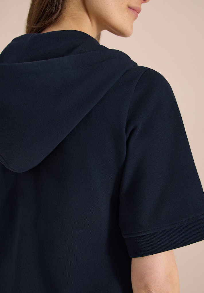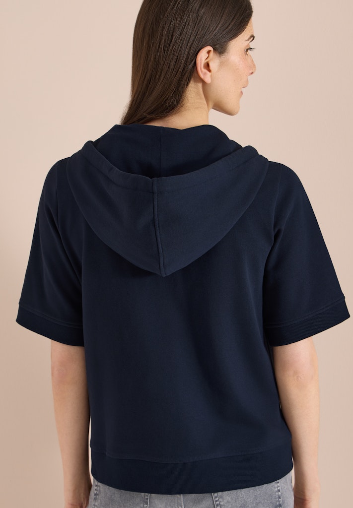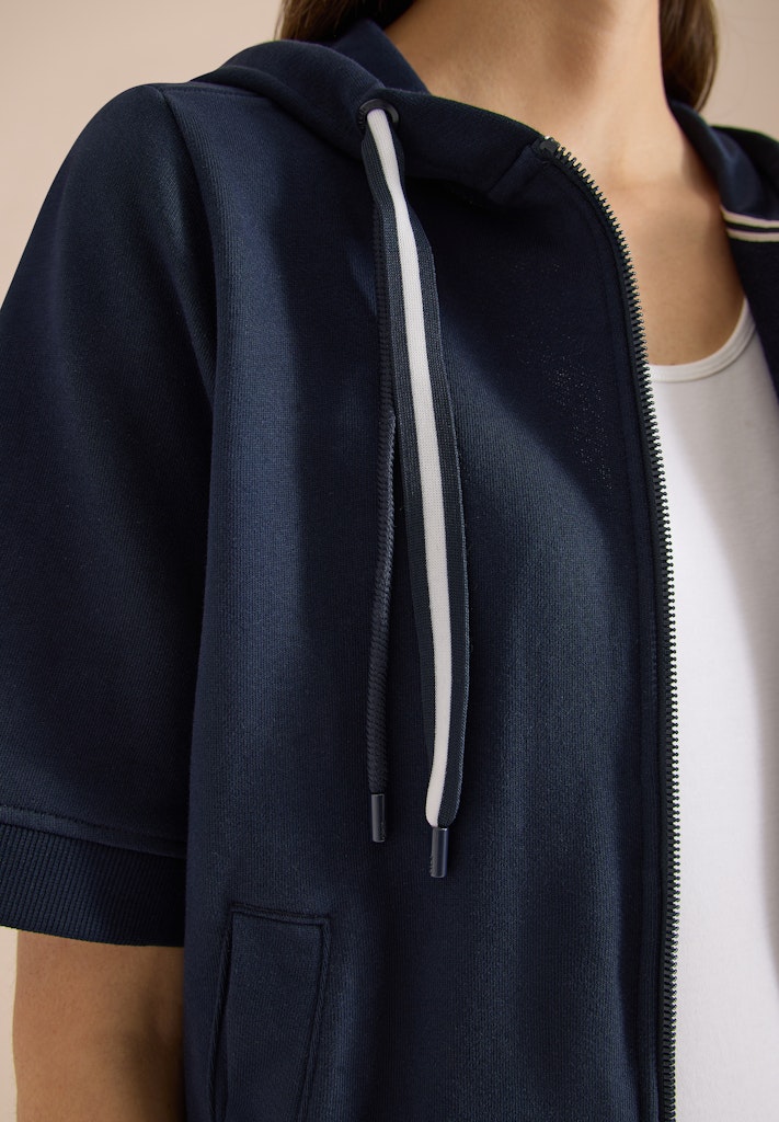 Die kurzärmlige Hoodie Jacke von CECIL für Damen überzeugt mit einem lässig-sportiven Look und angenehmem Tragekomfort. Die Kapuze mit Tunnelzug und Doppelstrings setzt moderne Akzente, während der durchgehende Reißverschluss das An- und Ausziehen erleichtert. Seitliche Taschen mit Druckknopf machen die Sweatjacke besonders praktisch. Aus reiner Baumwolle gefertigt, ist sie ideal für entspannte Freizeitlooks. Sommerliche Sweatjacke Kapuze mit Doppelstrings Kurzarm mit Ripptape Unifarbe Sweatware aus reiner Baumwolle Ideal zum Überziehen Sportiver Sommerlook Durchgehender Reißverschluss Material: 100% Baumwolle