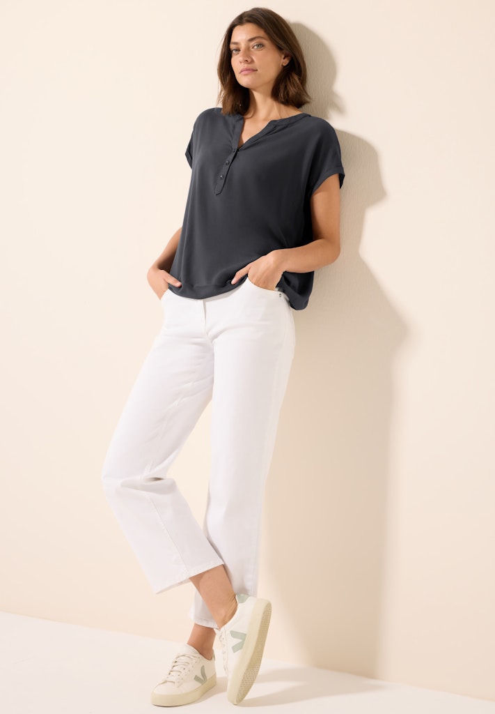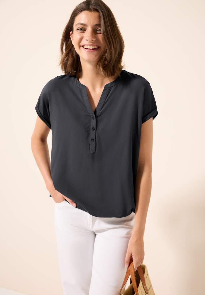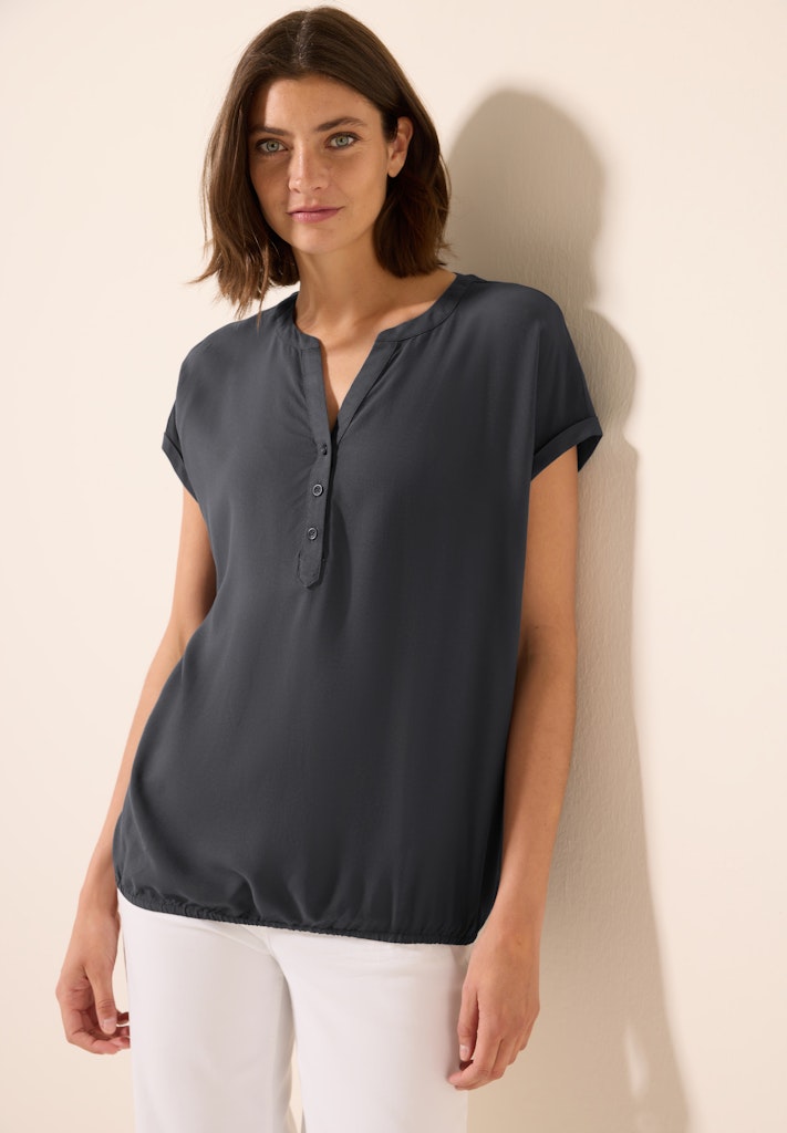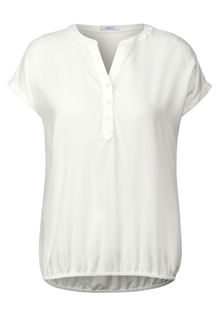Diese Damenbluse von CECIL punktet mit einem geschlitzten Ausschnitt und einer dekorativen Knopfleiste. Der elastische Saum sorgt für eine schmeichelhafte Passform, während die weiche Viskose angenehm auf der Haut liegt. Ein vielseitiges Basic für den Sommer! Damenbluse Geschlitzter Ausschnitt mit dekorativer Knopfleiste Kurzarm Elastischer Saum Weiche Viskose Material: 100% Viskose