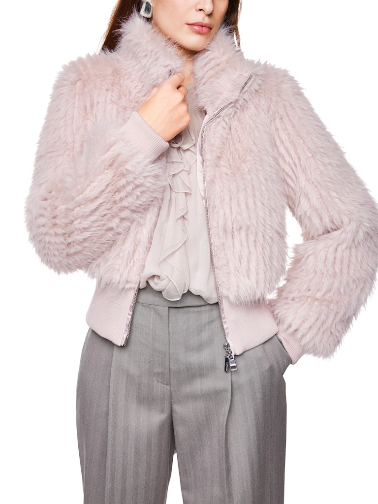 Kurze Kunstpelz Jacke|Die verkürzte und körpernahe Passform der Jacke, zusammen mit den Bündchen an Ärmeln und Taille, geben der Jacke eine coole Note. Der Kunstpelz hat eine langhaarige, Effekt-Optik und zusammen mit dem Stehkragen eine wärmende Funktion. Die Jacke wird mittels Reißverschluss geschlossen.|Kurze Passform|Körpernah|Reißverschluss|Bündchenärmel|Das Model ist 179 cm groß und trägt N3/38.