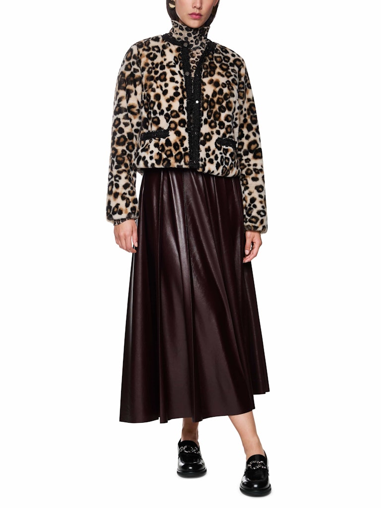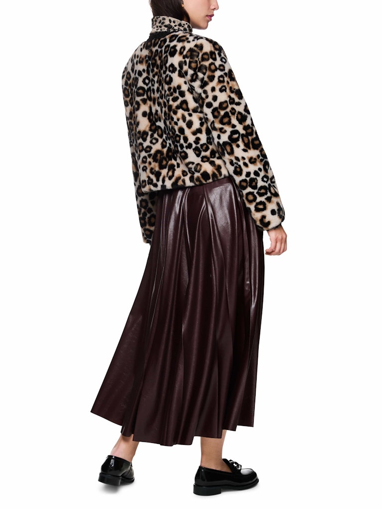 Kurze Leo-Print Jacke|Kuschelig weiche Jacke mit auffälligem Leo-Print. Das Modell hat eine gerade Form und einen klassischen Rundhalsausschnitt. Das bordeauxrote Steppmuster des Innenfutters sorgt für einen eleganten Look und zusätzlichen Komfort. Ausgestattet mit edlen Druckknöpfen und zwei Taschen bietet die Jacke funktionale Details. Die aufwendig gearbeiteten Akzente machen die Jacke zu einem stilvollen Begleiter für jeden Anlass - Ideal für einen modernen, aber dennoch komfortablen Look.|Gerade Form|Weicher Griff|Druckknöpfe|Aufwendig gearbeitete Details|Das Model ist 179 cm groß und trägt N3/38.