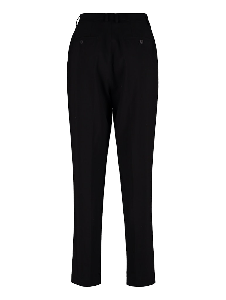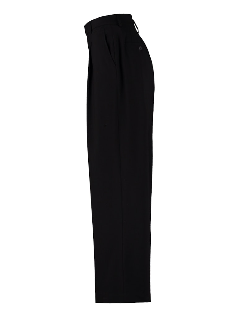 Hose mit Bügelfalten und weiten Beinen. Schräge Seitentaschen, Reißverschluss und Gürtelschlaufen.