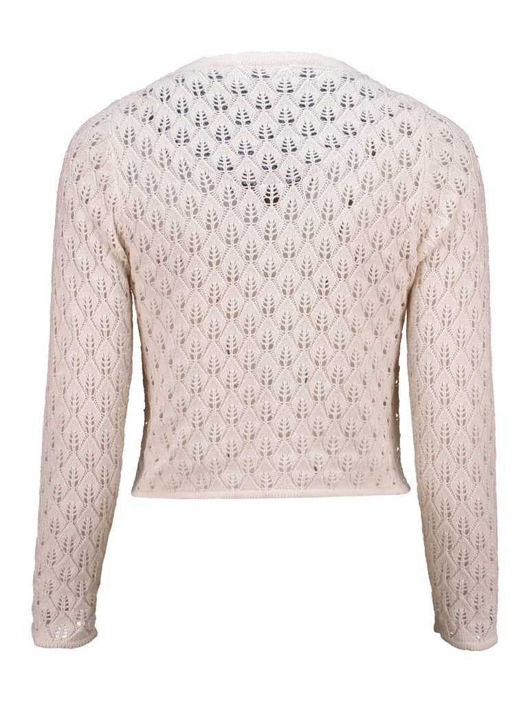 Gehäkelte Strickjacke mit langen Ärmeln und Rundhalsausschnitt sowie durchgehender Knopfleiste.