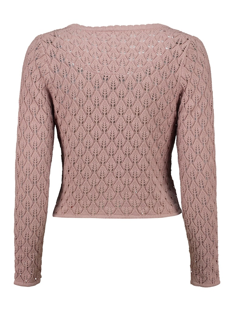 Gehäkelte Strickjacke mit langen Ärmeln und Rundhalsausschnitt sowie durchgehender Knopfleiste.