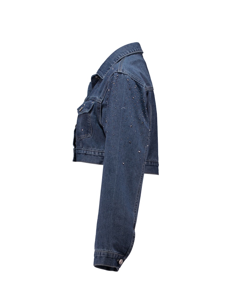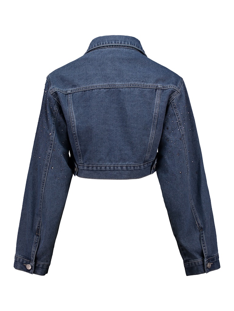 Jeansjacke mit Glitzer. Kurzer Schnitt und lange Ärmel, sowie Brusttaschen und Knopfleiste.
