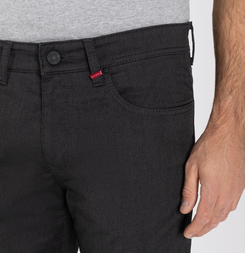 Modern Fit, gerades, schmales Bein, gemäßigte, bequeme Leibhöhe, Five Pocket, Structure Flex, feine, hochwertige Polyester-Viskose-Stretch-Qualität, einzigartig changierender Effekt im Material, angenehmer Griff, temperaturausgleichend, knitterarme Eigenschaften, pflegeleicht, hoher Tragekomfort, businesstauglich, Das Model ist 1,85m groß und trägt die MAC Bundweite 33 und Länge 32, Fußweite bei Größe 33: 40cm