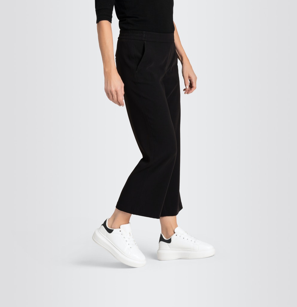 Wide Fit, Wide Leg, weites, gerades Bein, verkürzte Länge, Culotte, mittlere Leibhöhe, bequemer, elastischer Bund, Jump In-Modell, seitliche Eingrifftaschen vorne, Paspeltaschen hinten, Floating Crepe, hochwertige, langlebige Polyester-Krepp-Qualität, elegant-sportiver Look mit fließendem Fall, sehr angenehmer Griff, leicht im Gewicht, pflegeleicht, hervorragender Tragekomfort, Das Model ist 1,75m groß und trägt die MAC Hosengröße 36, Fußweite in Größe 36: 52cm