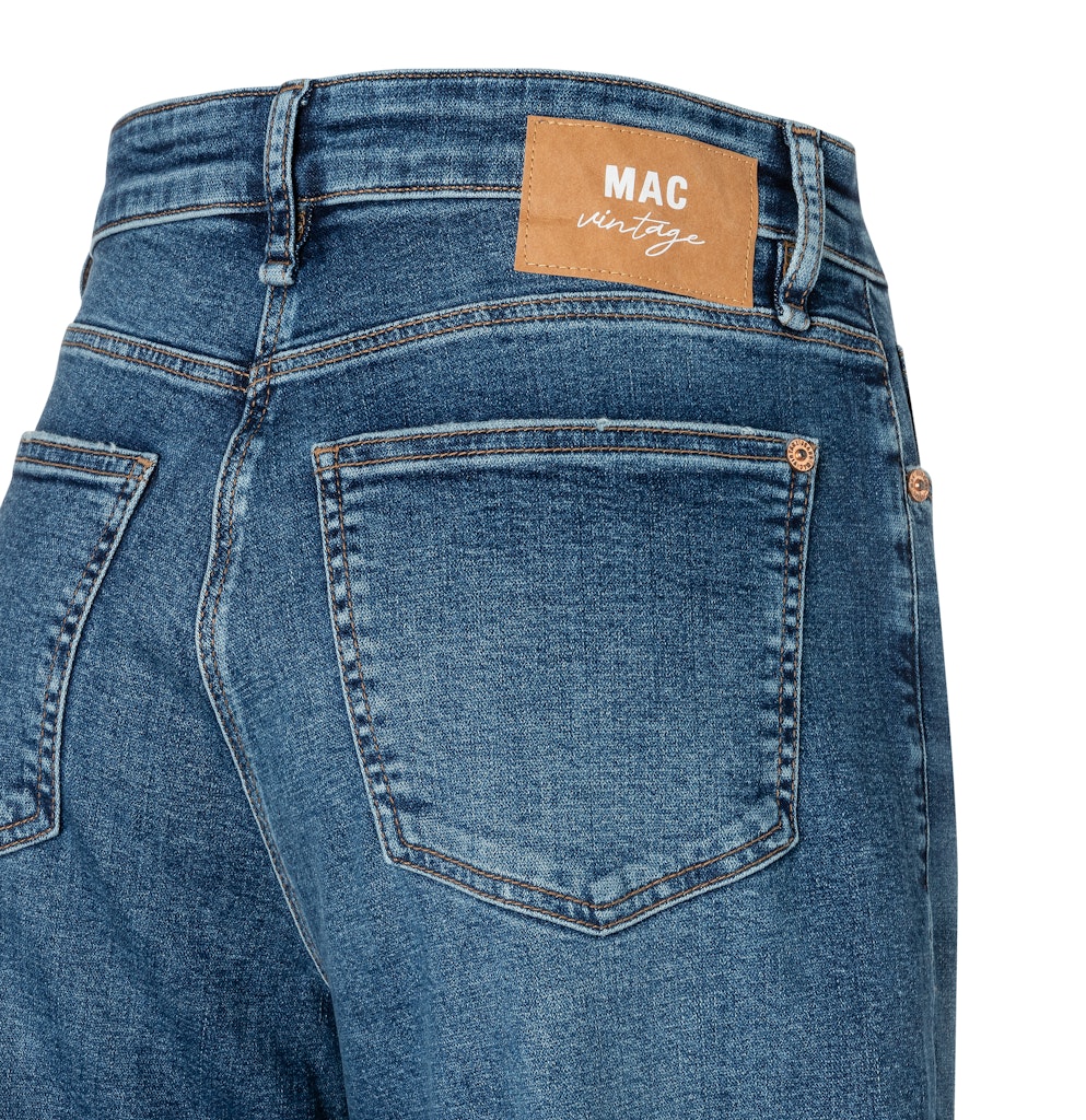 Barrel Fit, Barrel Leg, relaxtes Bein im O-Shape, hohe Leibhöhe, Five Pocket, bequemer, lockerer Sitz an Hüfte und Oberschenkel, Naht-Detail auf Kniehöhe, Authentic Comfort Stretch Denim, hochwertige, sehr elastische Qualität, authentische, strukturierte Optik, angenehmer Griff, moderner Vintage Look, hervorragende Passform, Das Model ist 1,75m groß und trägt die MAC Hosengröße 36, Fußweite bei Größe 36: 52cm